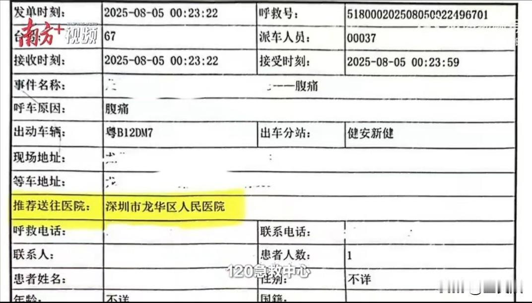 2025年8月5日凌晨0点20分许,家住深圳市龙华区的张女士刚睡下不久便突发腹痛,慌乱中丈夫双先生拨打了120急救电话。后来有据可查的信息显示,120指派出车单0点23分发给了深圳健安医院,该医院车牌号为“粤B12DM7”的救护车于0点34分抵达张女士居住的小区。