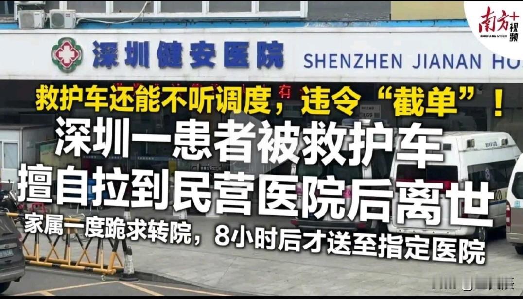 按照指派单,这起急救推荐送往的医院是深圳市龙华区人民医院,距离张女士家2.8公里。但是,上车后,该车司机和医护人员却拒绝了双先生提出的去龙华区医院的要求,答复是,我们的车属于深圳健安医院,只能去我们医院。那时候,张女士的家属还不知道,龙华区医院是“三级甲等”,而健安医院是“一级乙等”,还属于民营性质,且距离张女士家3.8公里。