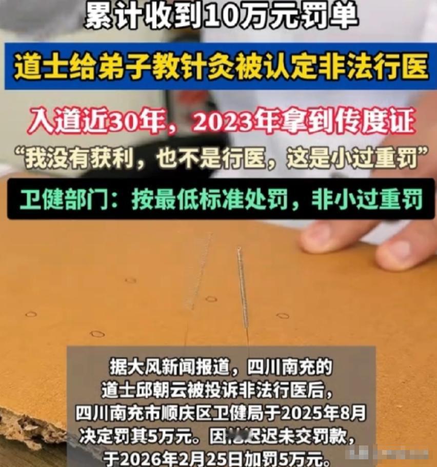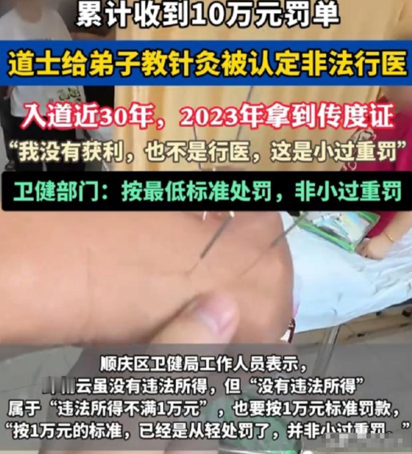 四川南充,一位61岁的老道爷,因为教徒弟针灸,被人举报非法行医,罚了5万。老头气不过,外出云游去了,结果罚款没交,又给加了5万,变成十万了!他这才急了眼,赶紧去申请复议,说罚得太重。