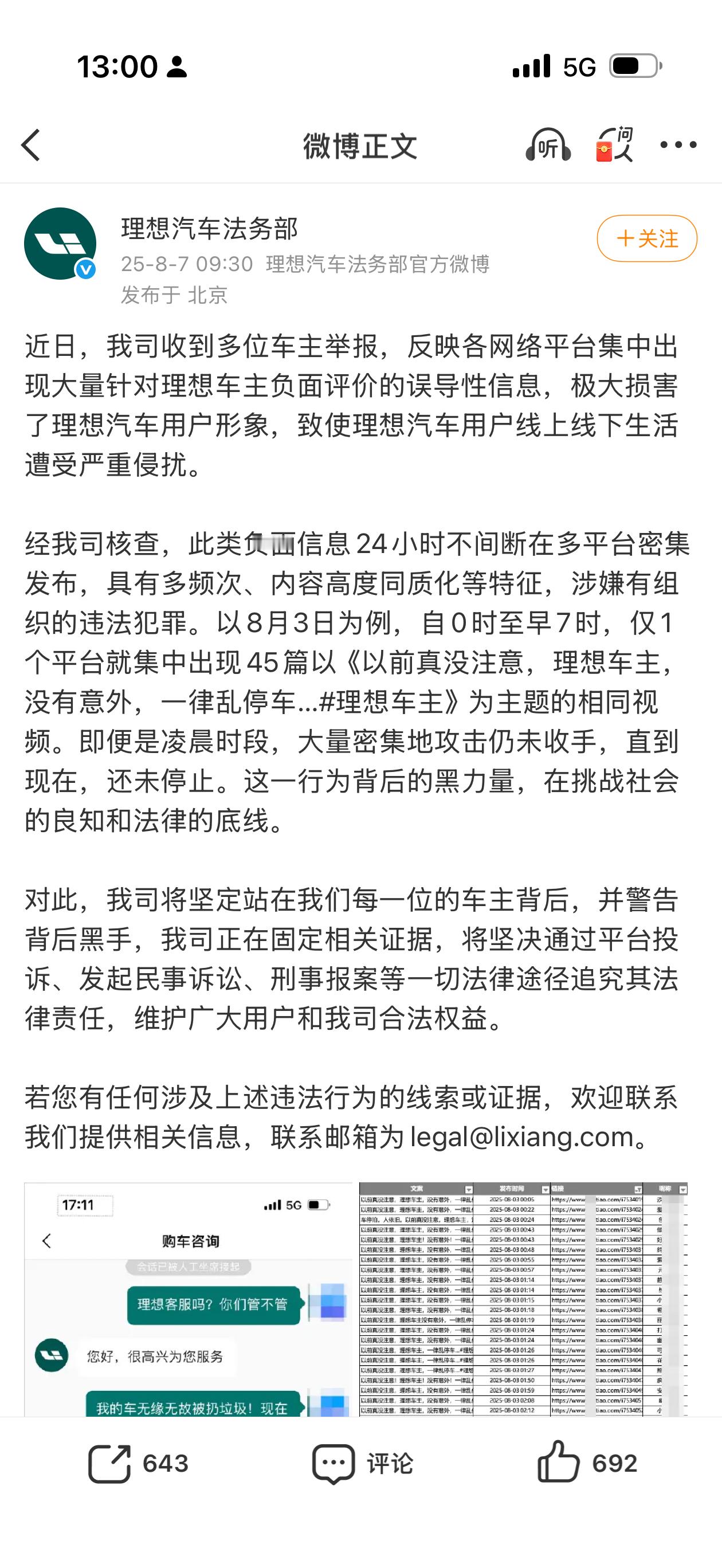不是,怎么又冒出一些博主指指点点说理想车主被黑没有反应的,我看法务部也出来过呀,