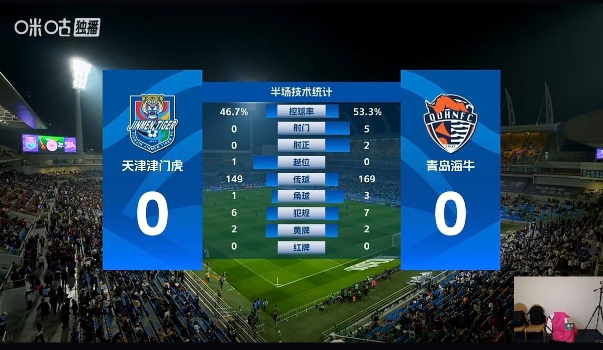 吴兴涵首发,上半场结束,天津津门虎0:0青岛海牛。2026中超联赛