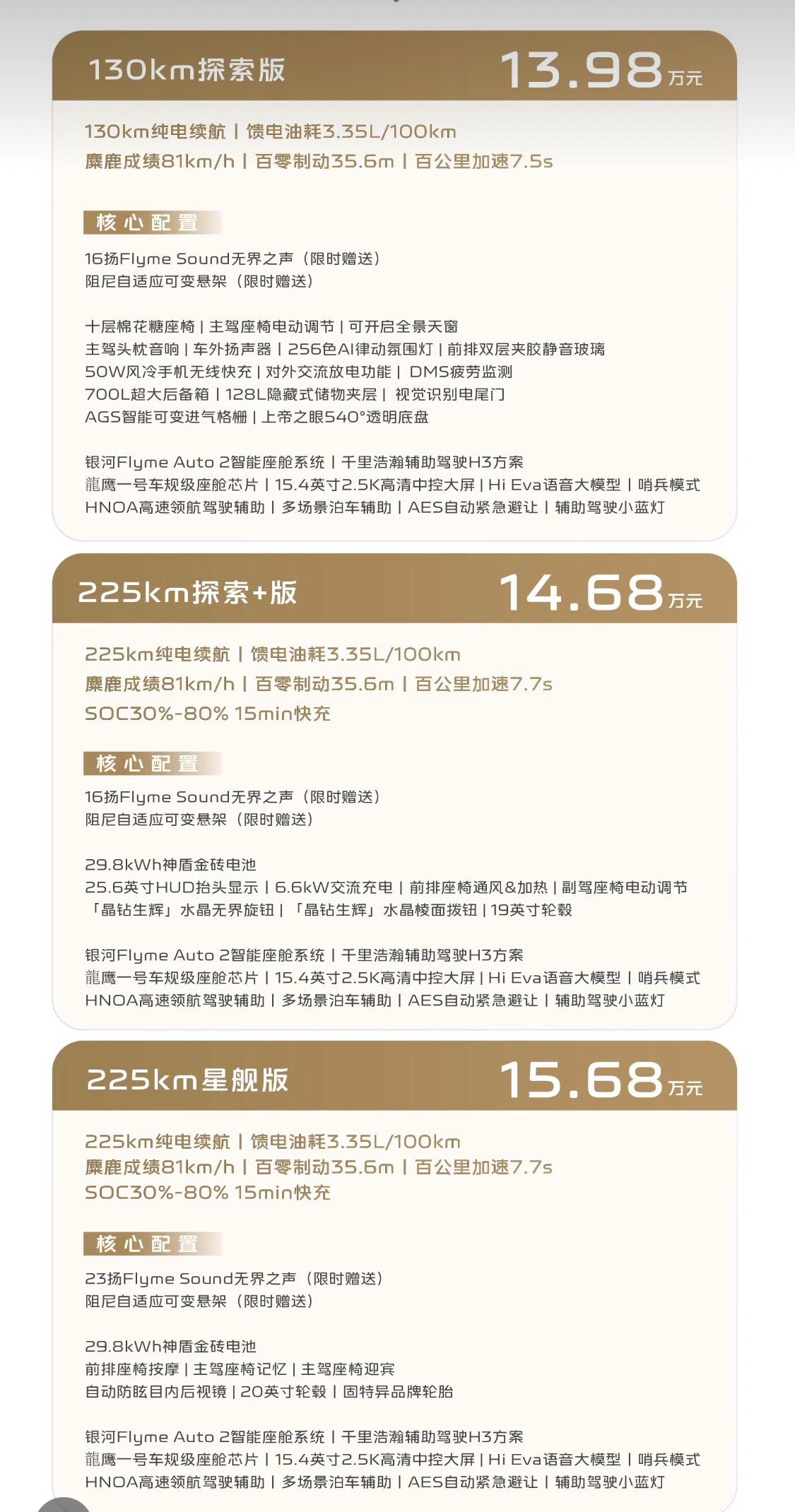 13.98万的130km探索版,入门就给了高速领航辅助,加上预售送的可变悬架和16扬声器音响,性价比拉满;