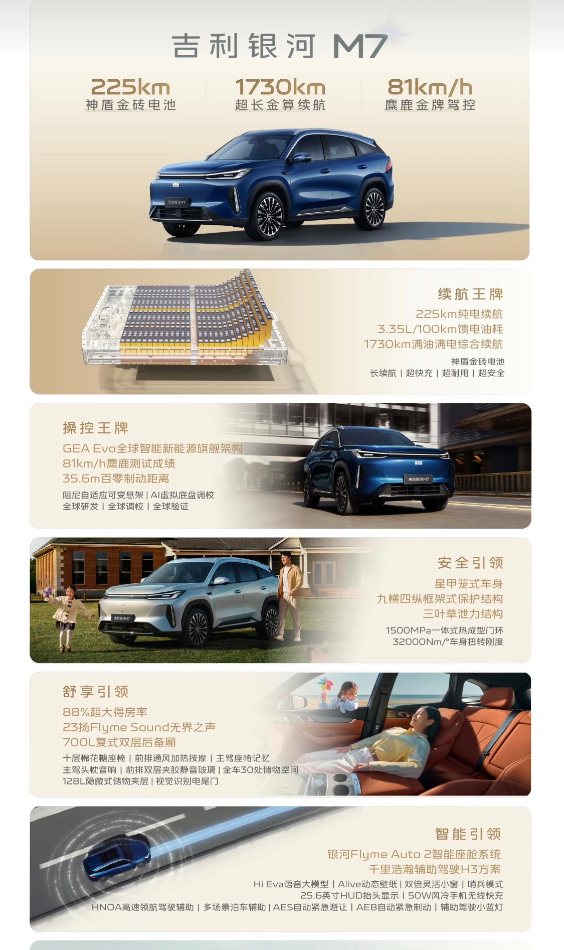 吉利银河M7 已经正式开启预售,13.98万-15.68万元的价格区间,三款车型,标配前双叉臂+后五连杆底盘,麋鹿测试81km/h。入门即配高速领航辅助,预售期全系赠送可变悬架和16扬声器音响,诚意非常足。
