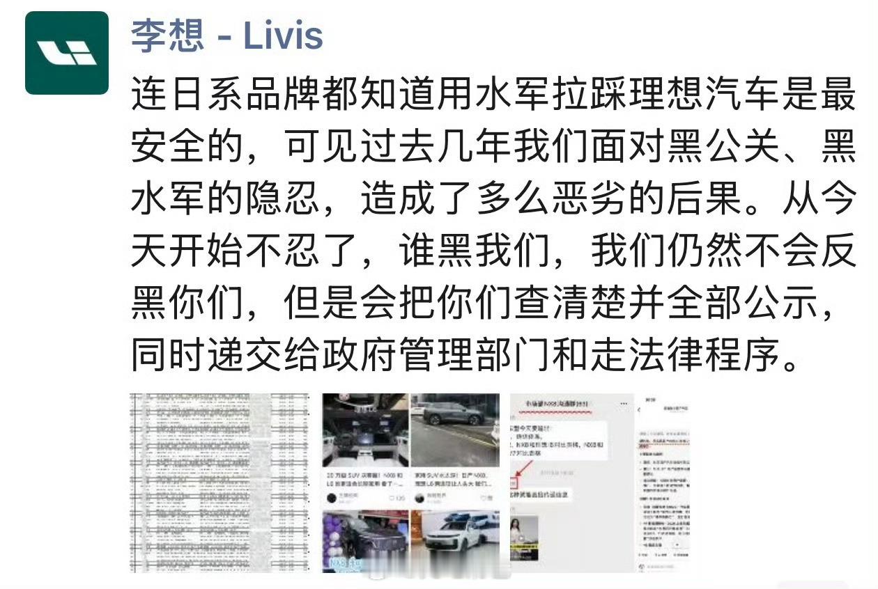 这个事情,如果要起到敲山震虎 杀鸡儆猴的作用,那就要一查到底,送进去几个,要不然L9上市的时候这些玩意儿还是会死灰复燃理想汽车