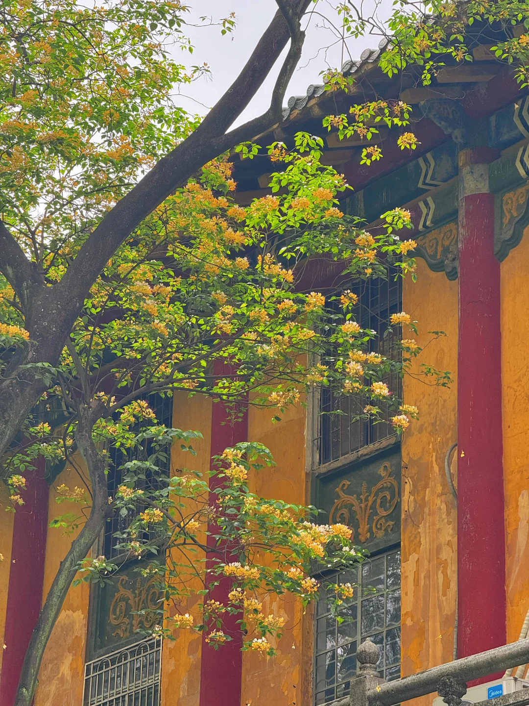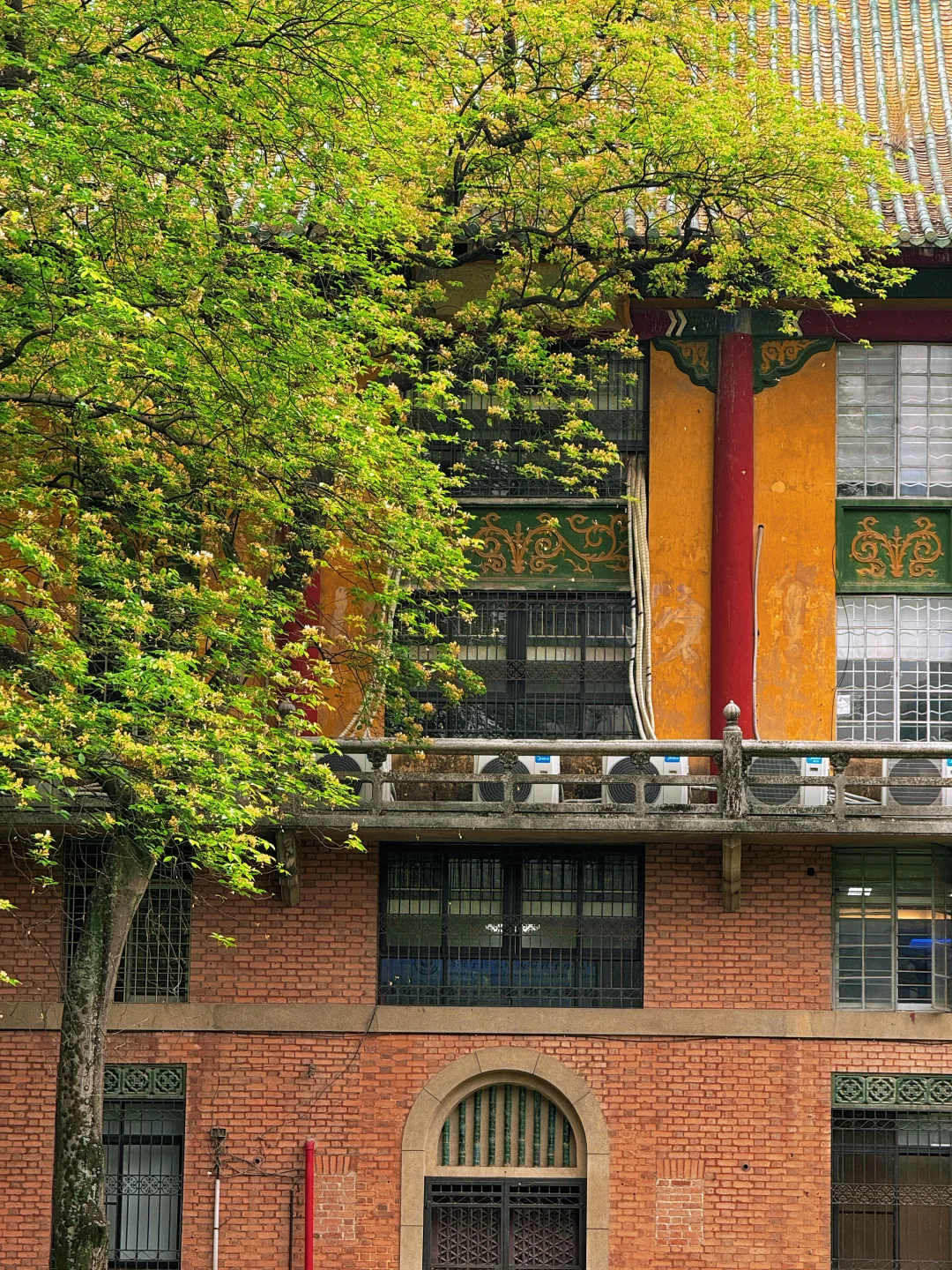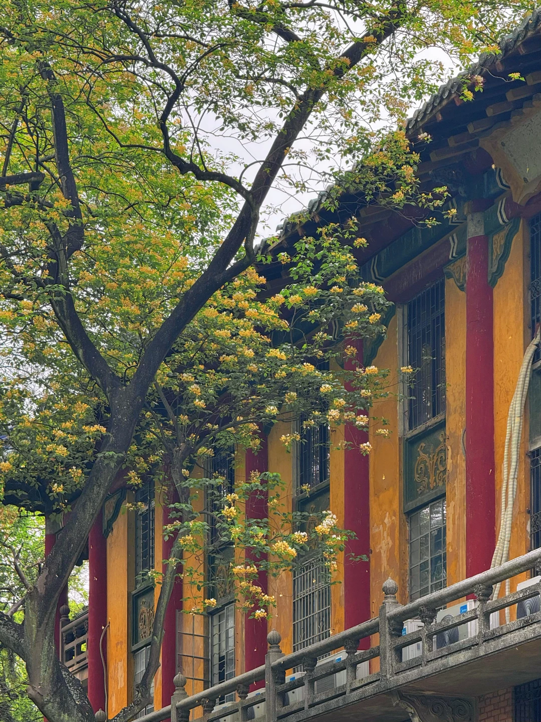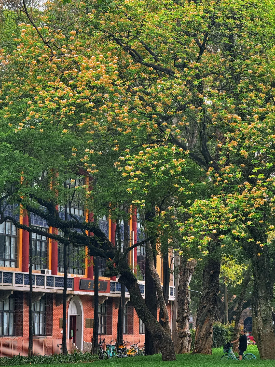 🙋🏻♂️🙋🏻♂️今天我专门去了中山大学南校区,百年红砖绿瓦旁,鱼木花正在盛放,虽然花不多,不过搭配这里的复古建筑真的绝美!