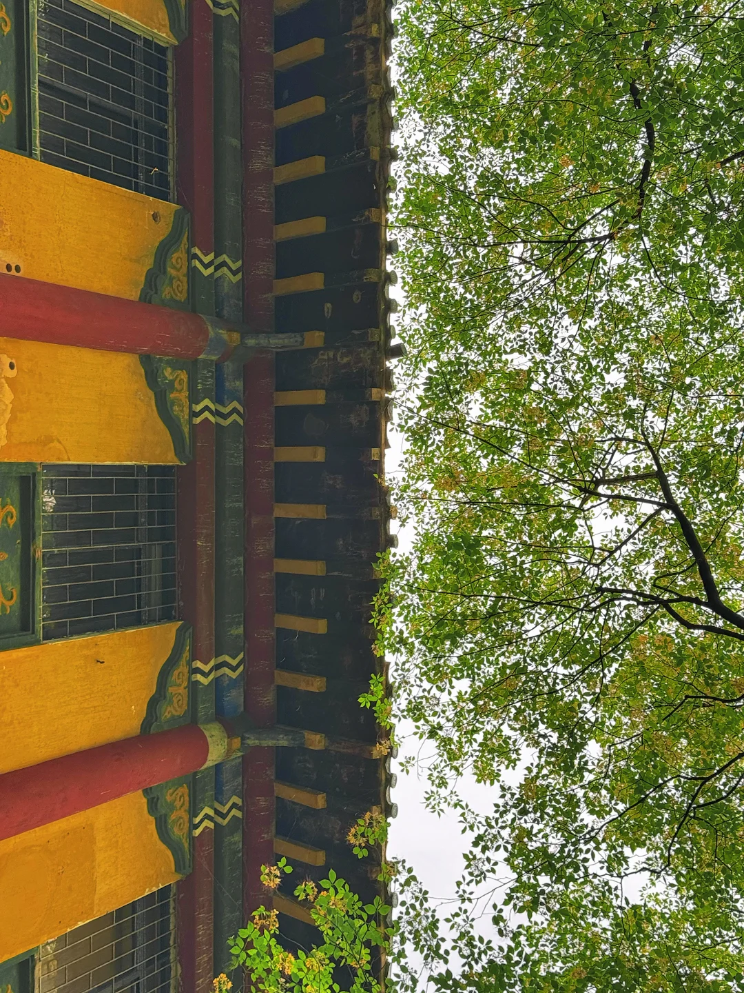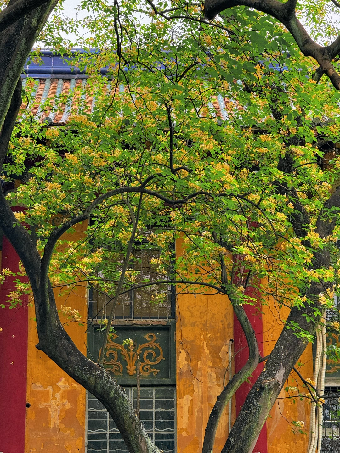 风吹过的时候,金黄色的花瓣絮絮飘落🌼🌼落在红砖绿瓦的老建筑前,那种画面真的像走进了电影里🎬🎬
