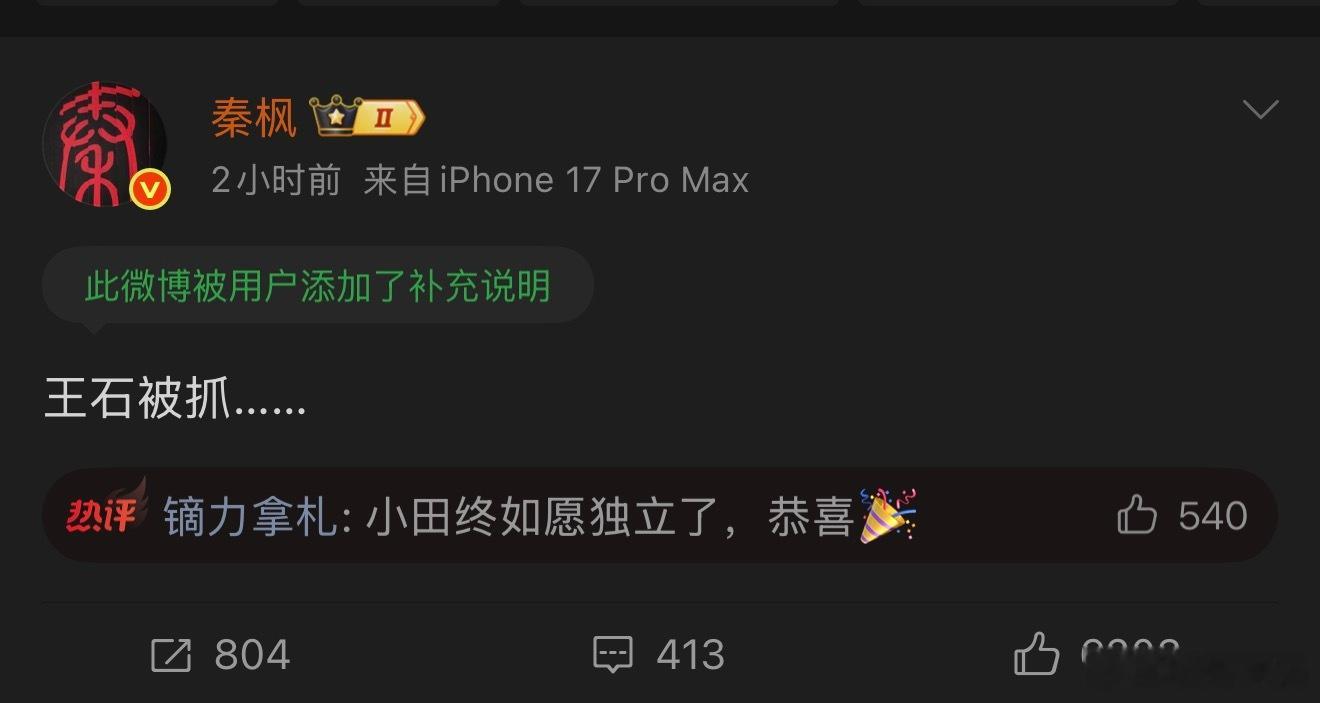 王石否认被抓 奇怪,如果只是普通营销号发这种猛料,那大概率开局一张图全靠编。但秦枫...好歹是有点背景资历的新闻记者目前王石亲自出来辟谣后这条被抓的微博还没删