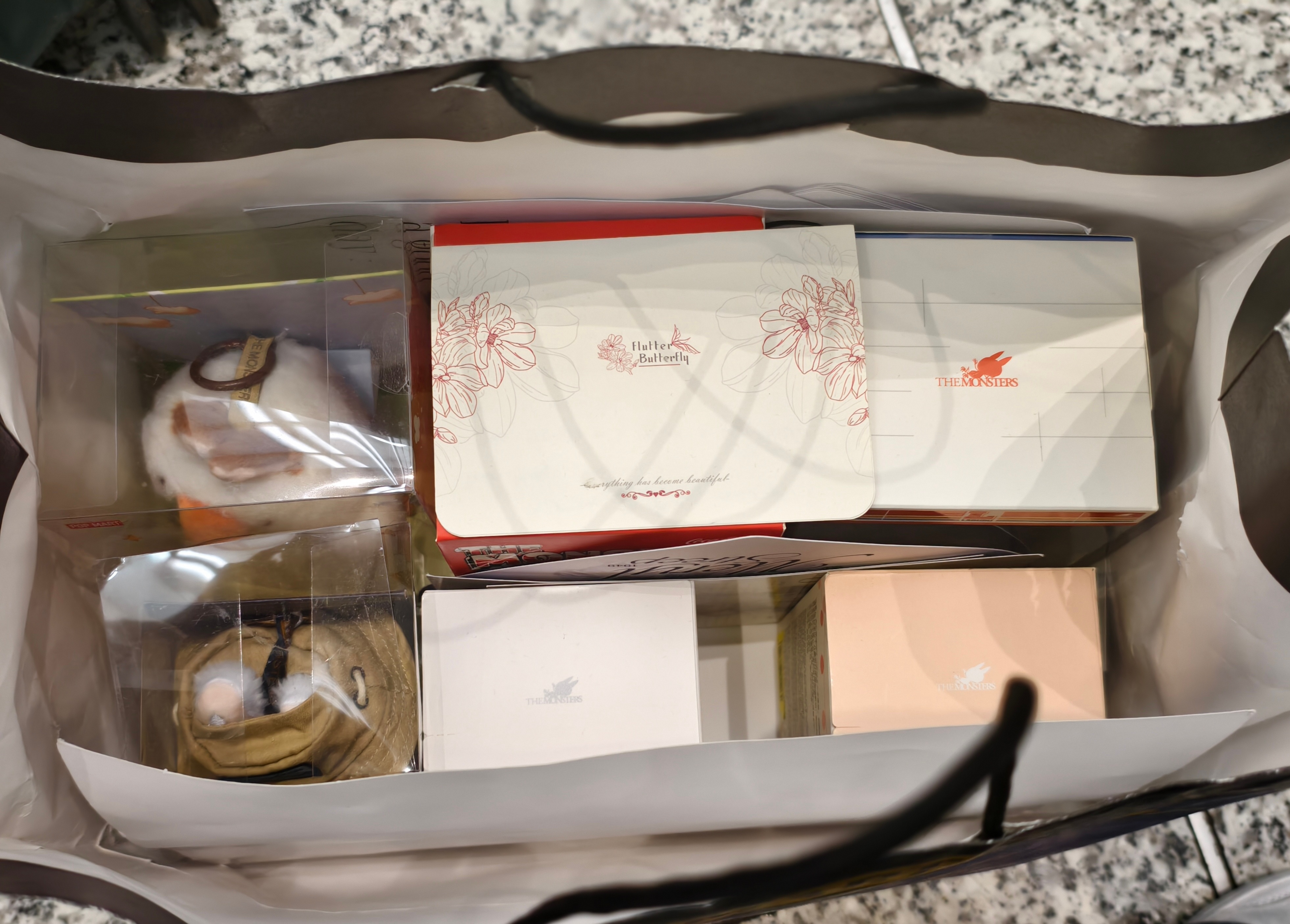 我们给老梅的孙孙准备的六个labubu,就这样原封不动带回去了有几个难买的款,找了好久全新的,我找的时候特别仔细,不带雪梨纸的都不要。我做爱心手幅,老梅也没机会看到,蹲现场的时候发给一些可怜的梅丝。