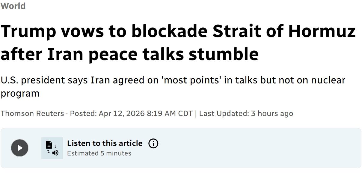 在经历了21小时的艰难谈判无果之后,特朗普周日声称伊朗在谈判中“大部分观点”达成一致,但在核计划上不同意,美国海军将立即开始封锁霍尔木兹海峡,此举再次导致局势紧张性大增,危及了脆弱的两周停火。