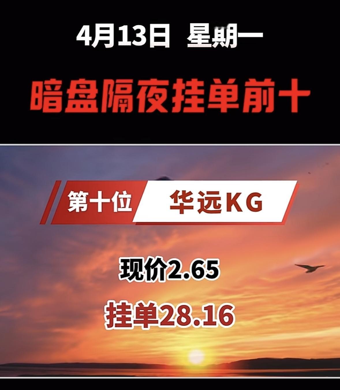 4月13日周一暗盘隔夜挂单排行榜出炉 4月13日暗盘隔夜挂单榜里,华远控股挺引