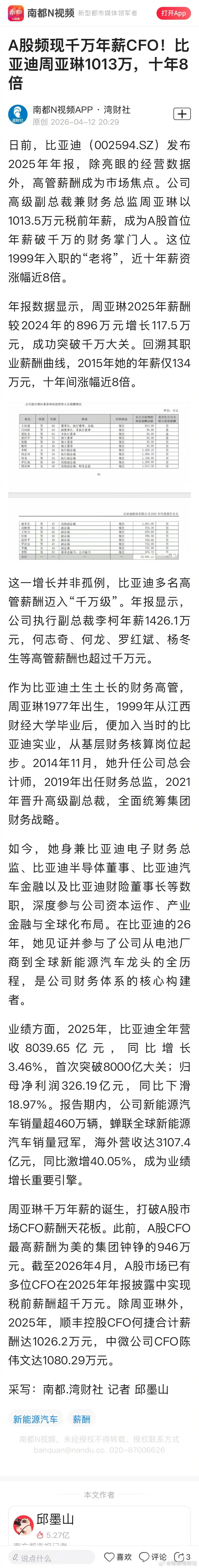 【#A股涌现多位千万年薪CFO#!比亚迪周亚琳1013万,十年8倍】#比亚迪周亚琳成A股首位年薪超千万CFO# 日前,比亚迪(002594.SZ)发布2025年年报,除亮眼的经营数据外,高管薪酬成为市场焦点。公司高级副总裁兼财务总监周亚琳以1013.5万元税前年薪,成为A股首位年薪破千万的财务掌门人。这位1999年入职的“老将”,近十年薪资涨幅近8倍。