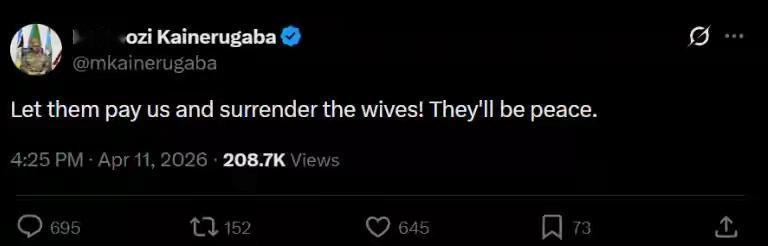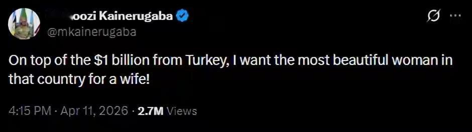 乌干达武装部队司令穆胡齐·凯恩鲁加巴向土耳其发出通牒:支付10亿美元“安全红利”,交出“最美丽的女人”,不然断绝外交关系。