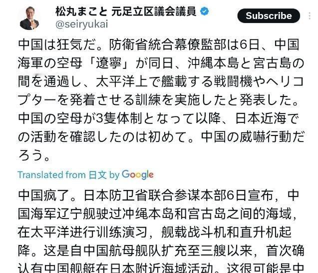 日本议员松丸诚表示,中国简直是疯了。日本防卫省统合幕僚监部6日发布消息称,中国海军航母“辽宁”舰于当日穿过冲绳本岛与宫古岛之间的海域,在太平洋上实施了舰载战斗机及直升机的起降训练。这是中国航母编队扩充成3艘以来,首次确认其在日本近海开展活动。这无疑是中国的威慑挑衅行为。