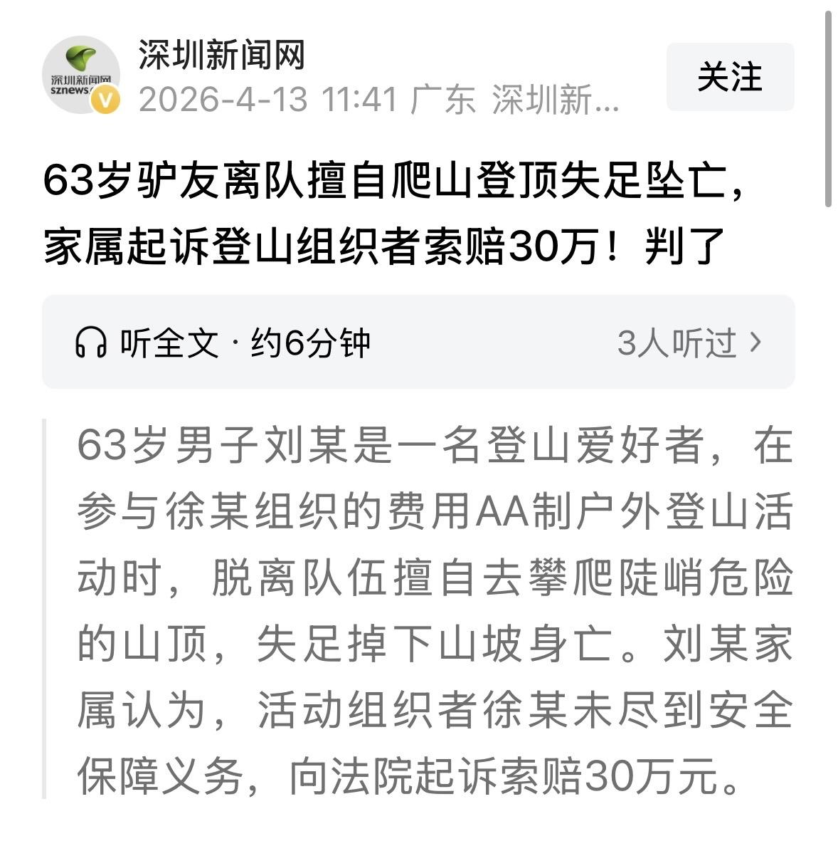 山东聊城,63岁男子爱好登山,他参加了一领队组织的户外登山活动,领队再三强调“别掉队别乱跑”,可男子因为没爬过瘾,对领队的嘱咐充耳不闻,擅自离开队伍去爬陡峭的山顶,结果一个失足坠亡了…这下男子家属不干了,他们认为领队没有尽到安全保障义务,后诉至法院索赔30万。法院判决出乎意料!
