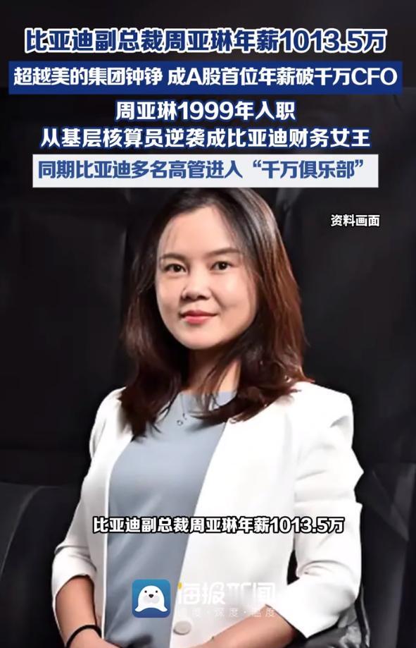 汽车行业也是好起来了,高管薪酬越来越高了,比亚迪最新报告显示,2025年公司高级副总裁兼财务总监周亚琳年薪达到1013.5万元,增长117.5万元,成为A股首位年薪破千万的财务掌门人。