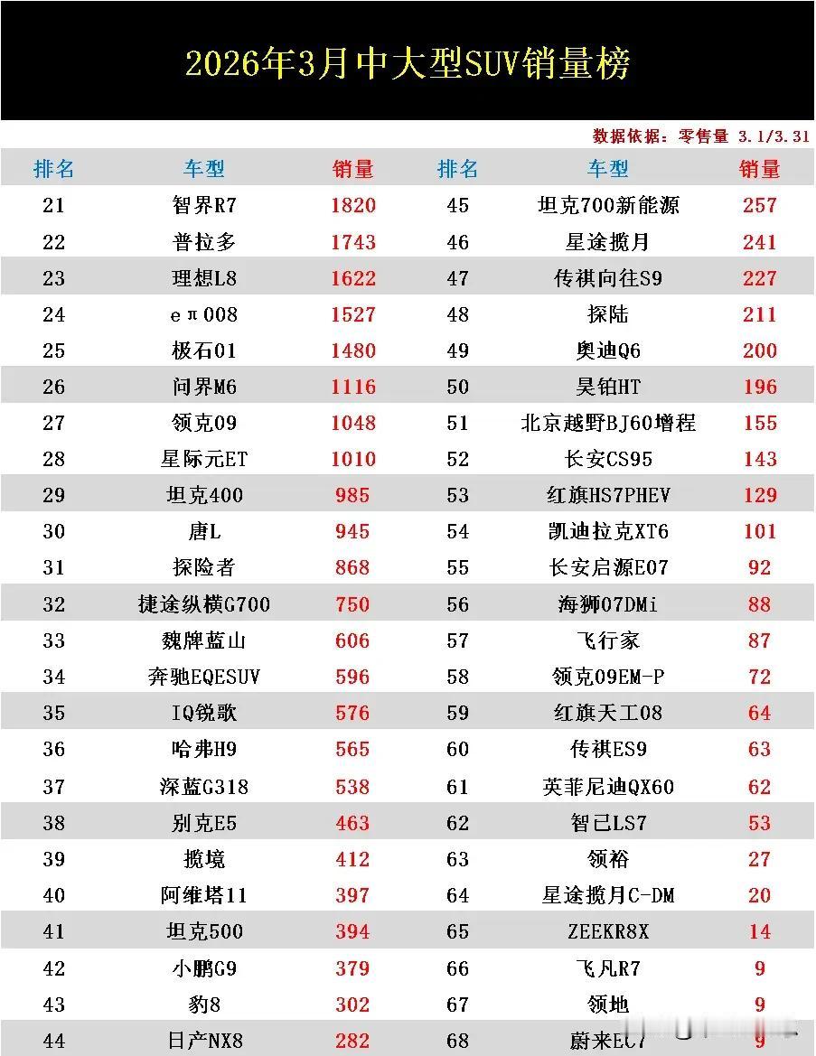 中大型SUV别乱买!快来看看乘联会近期刚刚公布的2026年3月中大型SUV销量排行榜吧?了解一下大家都喜欢买什么车型,让你选车不迷茫,买车也有所依据。
