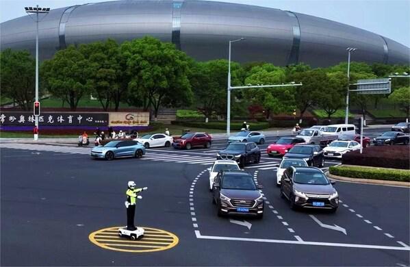 智能交通指挥——能实时联动信号灯,配合红绿灯节奏做出标准的国标指挥手势,提示行人等待或通行时间。