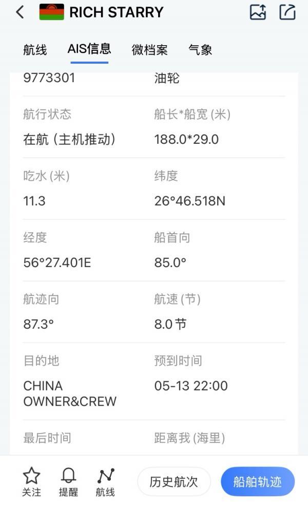 风浪越大鱼越贵,“RICH STARRY ”号油轮正在伊朗海峡航行 早晨6点2
