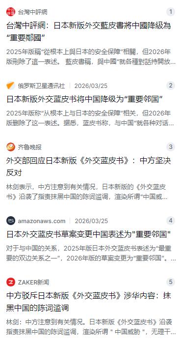 2026年3月24日,日本外务省完成了新版外交蓝皮书的草案,4月10日在内阁会议上正式报告通过。最关键的变化是:关于中日关系的定位,从2025年版的“最重要的双边关系之一”,直接降级成了“重要邻国”。少了“最重要”三个字,外交辞令里的降级意味太浓了。要知道,2025年那本蓝皮书还把中日关系定性为“从根本而言与日本的国家安全息息相关”,到2026年版这句话也删得干干净净。日本外务省对外的解释是“只是还原客观事实”,但谁都看得出这是在配合首相高市早苗的政治路线。