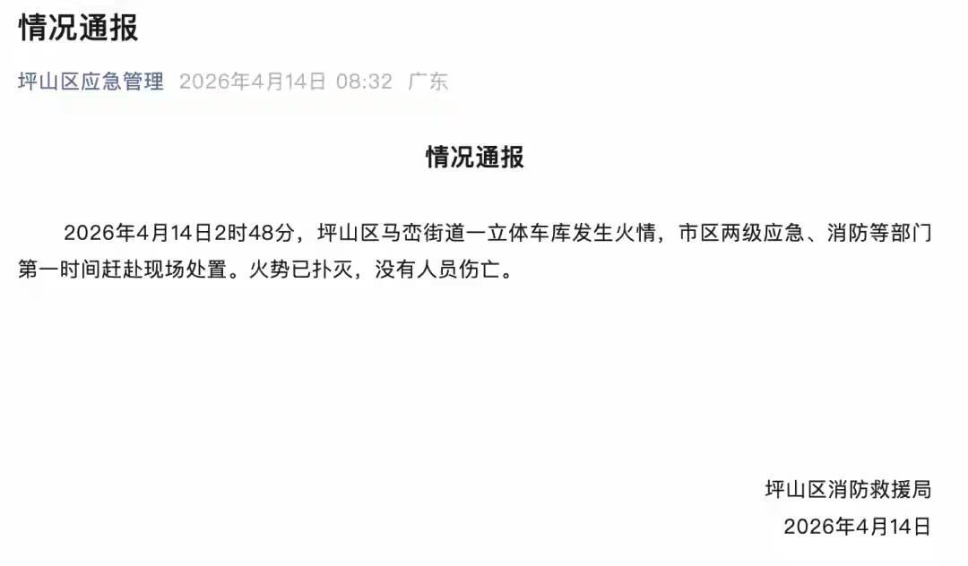 深圳比亚迪立体车库发生火灾,坪山区应急管理局发布通告,称火灾于14日凌晨2时48分发生。从网友在网上发布的视频来看,天亮时仍可见火苗与浓烟,这意味着大火至少燃烧到了早晨五六点。