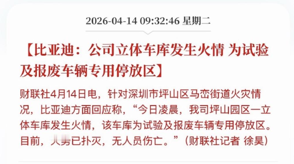 4月14日凌晨坪山园区着火,官方说得很清楚 ,那是试验和报废车辆停放区,火灭了,也没人受伤。这就是起普通的工业园区火情。