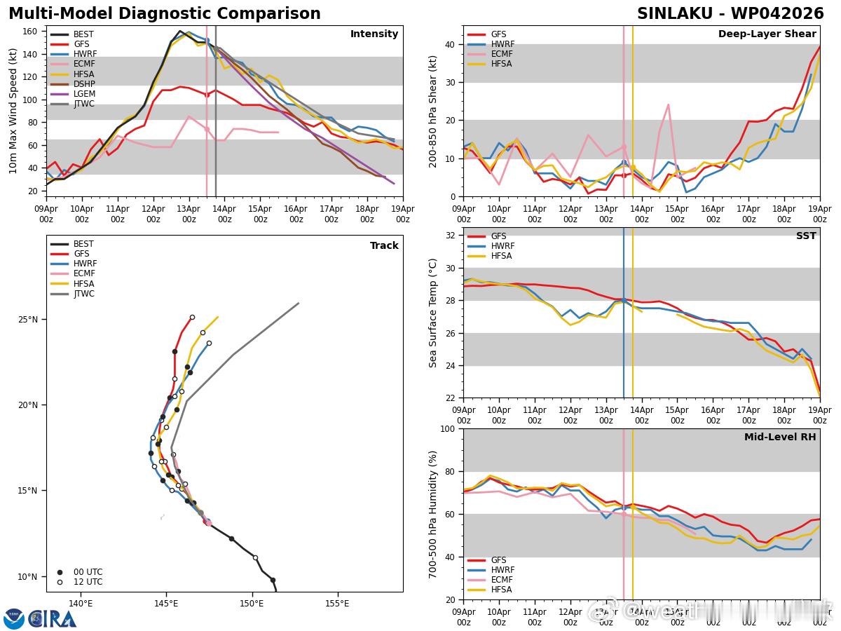 【超强台风森拉克】从今晨的云图对比看,森拉克的强度在减弱,核心对流区的高度下降,凌晨4时云顶亮温还有低于零下80℃的粉色区,9时已经是灰黑色的零下70℃区(云顶越冷、越高、对流越强)。未来前进路径上,海温下降、垂直风切变加大、中层湿度也下降,有干空气卷入,强度将继续下降。