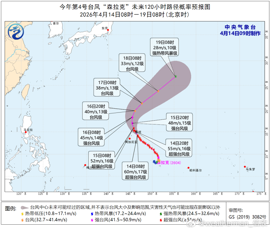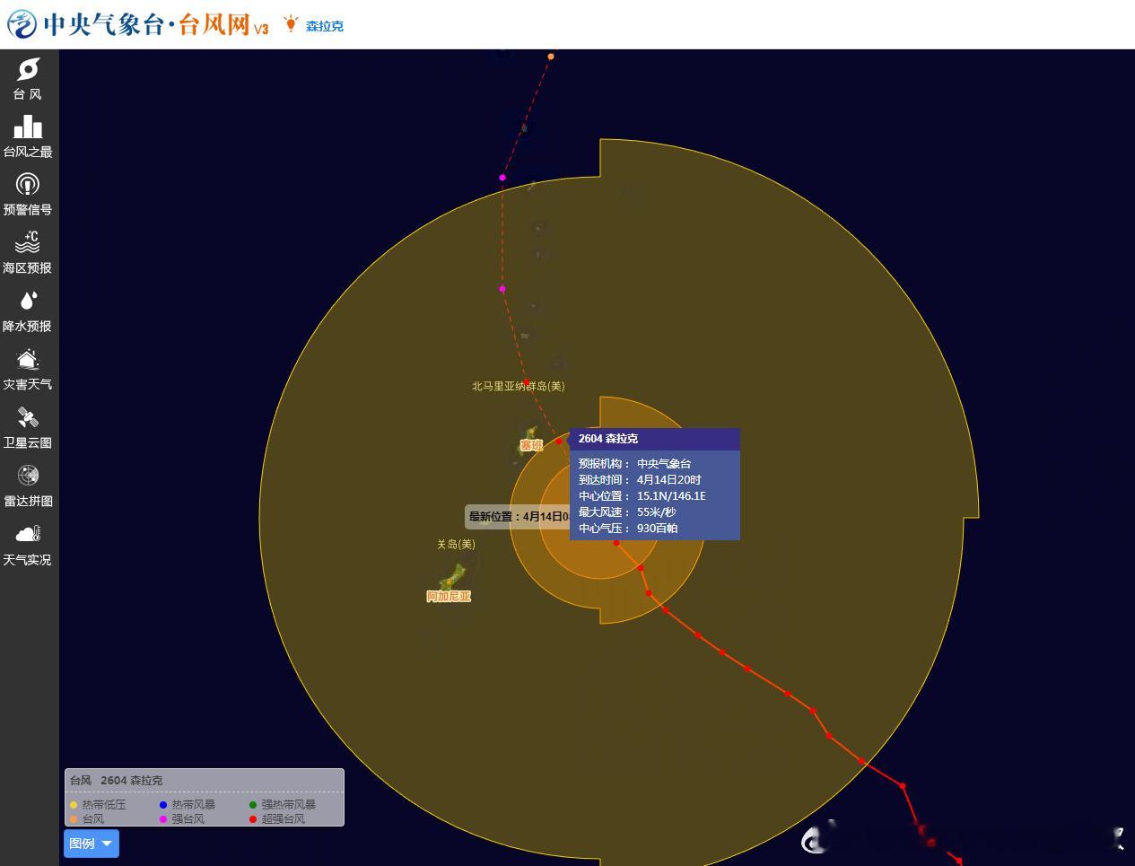 从路径预报看,相比之前向东北调整,今晚可能从塞班岛东侧近海掠过,但也不排除登陆塞班岛的可能性。总之,今天傍晚-前半夜是对塞班岛影响最严重的时段。15-16日,森拉克北上为主,17日以后加速向东北行。对我国无影响。