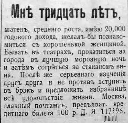 1.我一无所有:只有善良的灵魂、正直的品格和伯爵头衔。本人30岁,受过中等教育,勤劳肯干,希望和一位富有的女士结婚并感谢她的支持。2.请寄给我照片。8月1日我会将所有收到的照片混在一起,随机抽出3张,再从中挑选一位妻子。我30岁,相貌端正,金发,在私人机构任职,月薪1200卢布,不喝酒。3.我无论去往何方都孤身一人,满怀忧愁,无处寻得安慰,难道我生来就注定这样孤独?回应我吧!安慰我吧!我期盼着你那颗温柔的心。唯有在你的怀抱里,我才能寻得慰藉,唯有在你的爱抚中,我才有所寄托。我还年轻,虽然家境贫寒,但请明白,这并非关键!你在我身上,只会看到温顺与谦和。而家庭里的宁静幸福,将是我们二人共同的归宿。4.我三十岁,浅棕头发,中等身材,年收入20000卢布,希望能与一位容貌姣好的女士相识。我们可以一起去剧院看戏,在凉爽的夜晚乘车出城兜风,一起饮酒暖身。在彼此深入了解后,我不反对步入婚姻,并愿为我的意中人奉上生活的一切欢愉。5.我黄金般珍贵的妻子啊,难道你听不见丈夫的哀鸣?我是一名家境优渥、性情谦和、灵魂美好、独具一格的应届毕业生,为了与你分享、一同实现那些美好而有趣的人生规划,现寻觅一位可以成为知心伴侣的妻子:她需容貌讨喜、聪慧知性,且家境富裕,可为少女或年轻女士。愿你读懂我字里行间的心意,为我的人生添上崭新篇章。