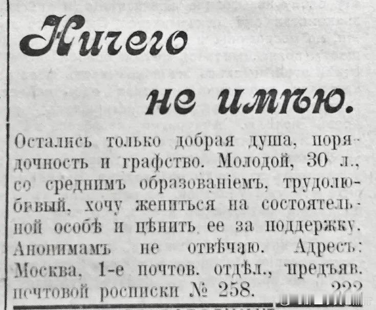 沙俄时期的男性征婚广告1.我一无所有:只有善良的灵魂、正直的品格和伯爵头衔。本人