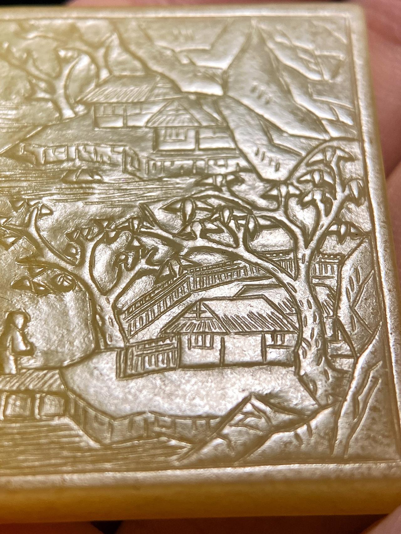 黄沁白玉如蜜蜡流淌,正面山水里二文人踏桥而行,枫树摇曳间湖光山色一眼千年;背面刻着五峰山人(文伯仁)的春日诗句,连“子冈”印款都带着明代刀工的爽利!4.3cm的方寸之间,把江南春景和文人风骨都凝在玉里了~这才是真正的“小中见大”,明代玉牌的空灵意境直接戳中审美!