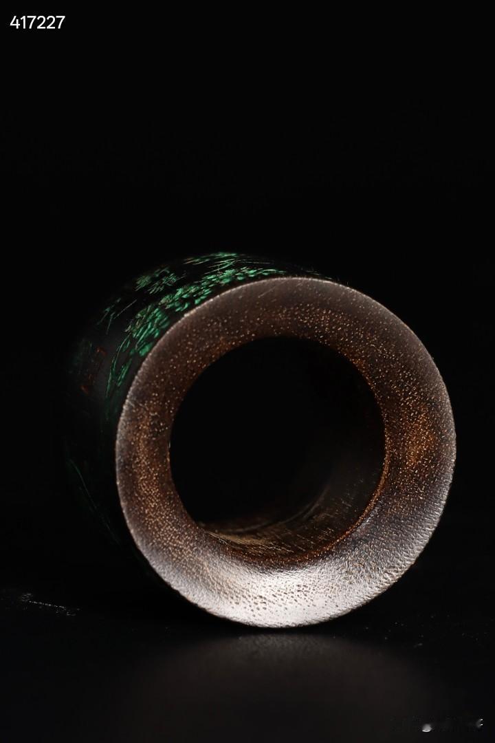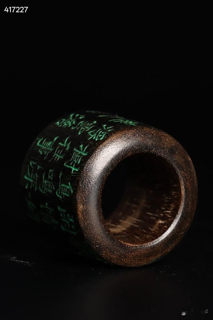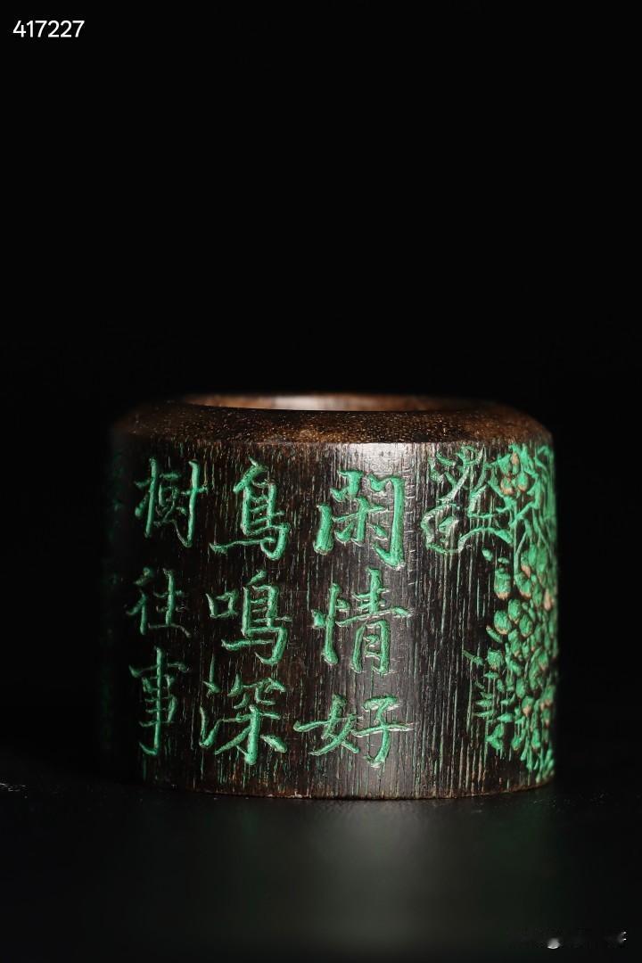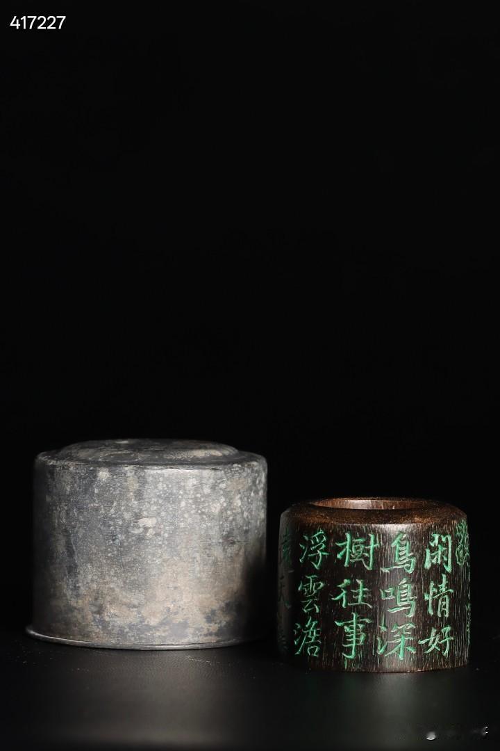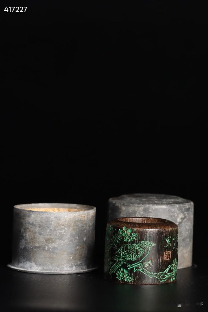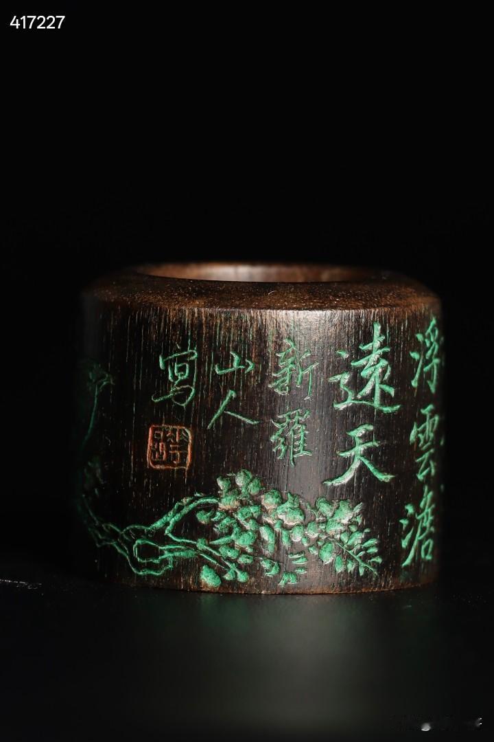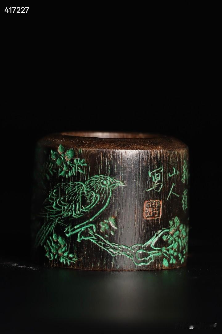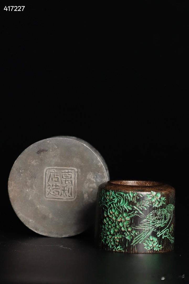 此件清代沉香扳指,取天然沉香整料掏制而成,油脂饱满丰润,质地温润缜密,经百年岁月醇化,香气清润绵长,层次丰富,尽显顶级奇楠之韵。扳指包浆醇厚老道,皮壳熟旧自然,品相完好无裂补。器身以阴刻填绿彩工艺,一面精雕花鸟图,禽鸟灵动传神,花枝舒展雅致,线条流畅细腻;另一面阴刻行书诗文,笔意洒脱遒劲,金石韵味十足,落款“新罗山人”并钤印,为清代书画名家款识,文人气息浓厚。原配锡制盖盒,形制规整,包浆温润,盒底錾“万利店造”款,为清代老商号制器,保存完好,与扳指成套传世,更属难得。整器集顶级香材、名家款识、精湛工艺于一体,是清代文玩扳指中的臻品,兼具极高的艺术价值、收藏价值与历史文化价值。