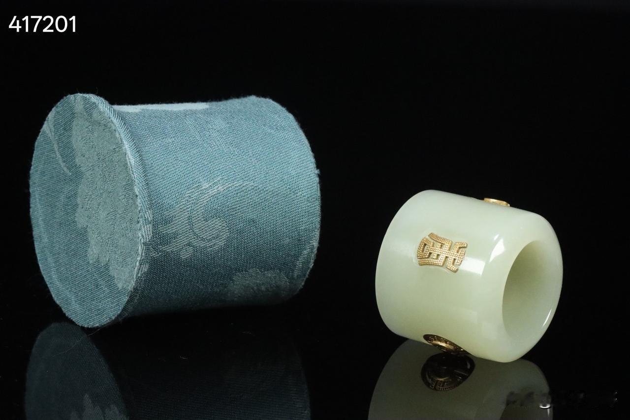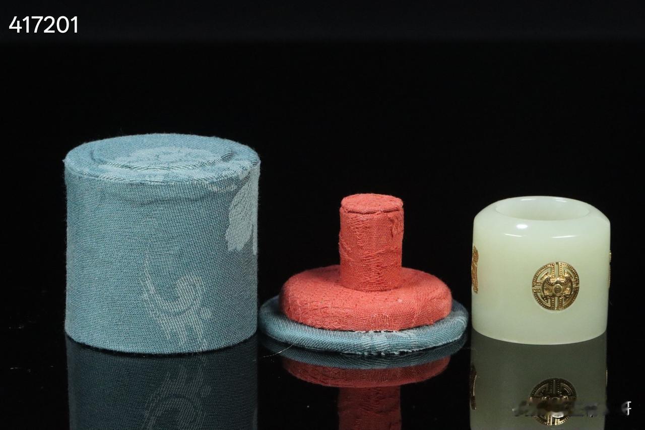 晚清 和田玉嵌银鎏金团寿纹扳指 老绣布扳指盒一套。