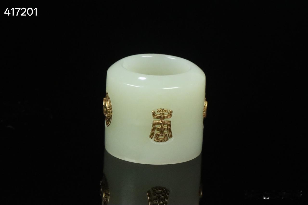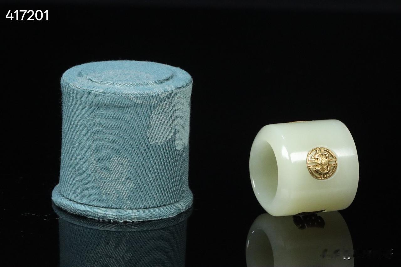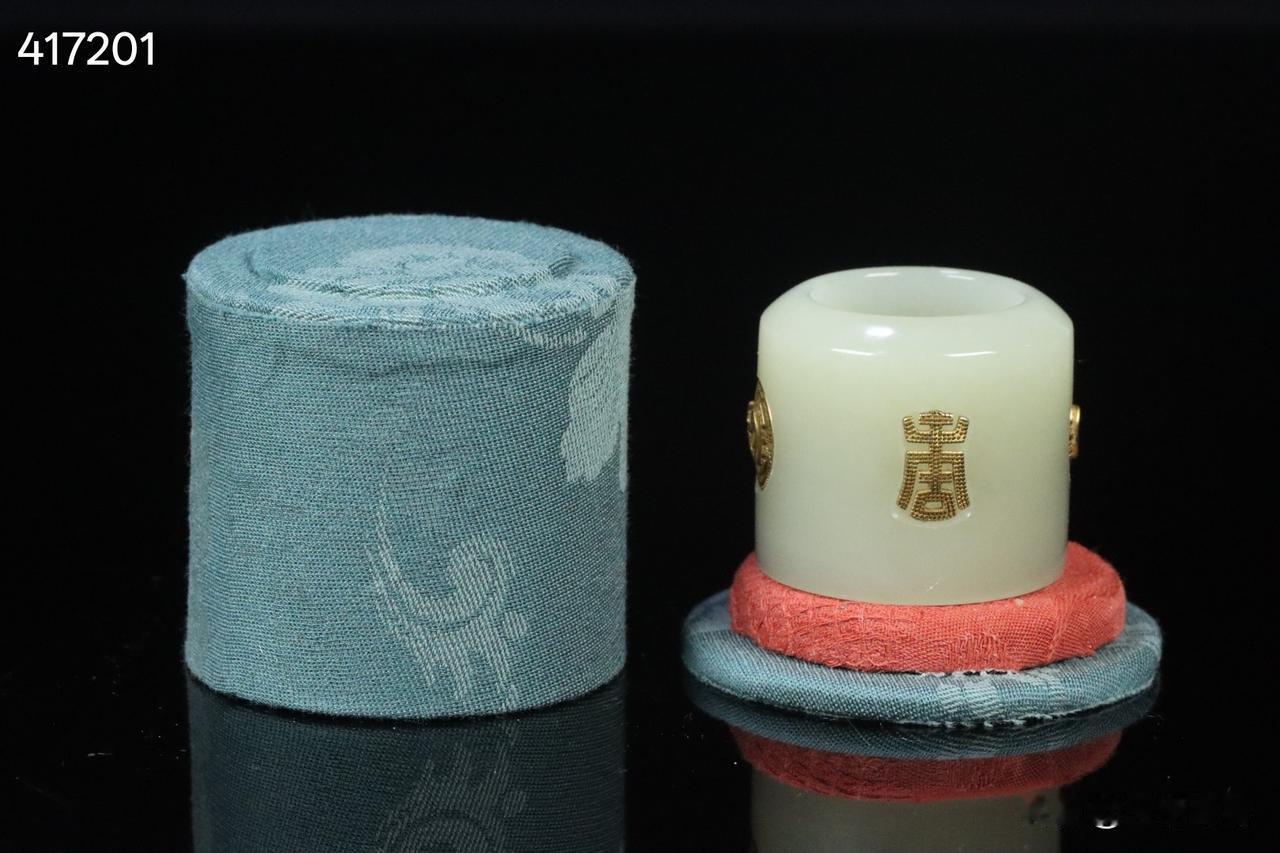 晚清 和田玉嵌银鎏金团寿纹扳指 老绣布扳指盒一套。 规格:3.15*3.78