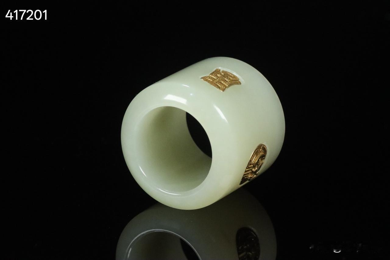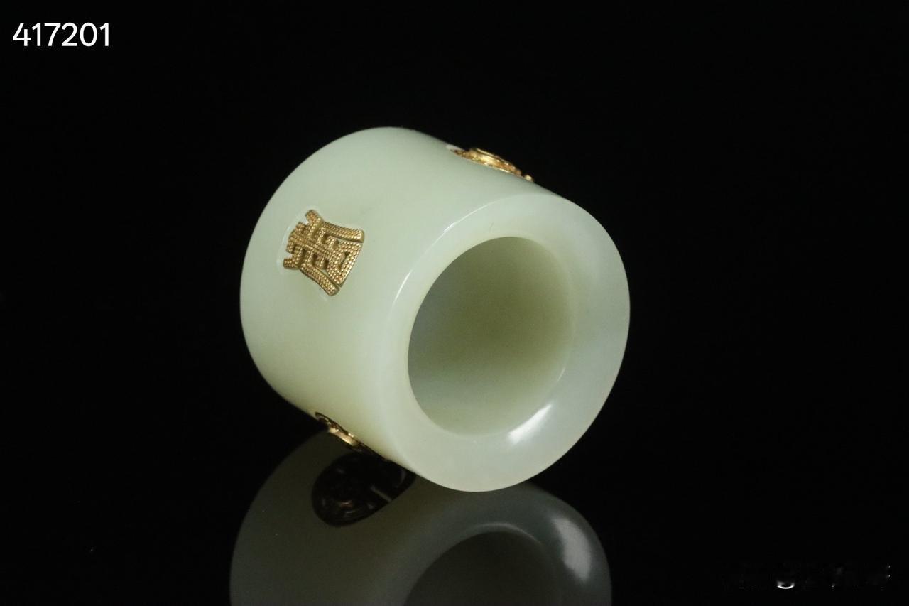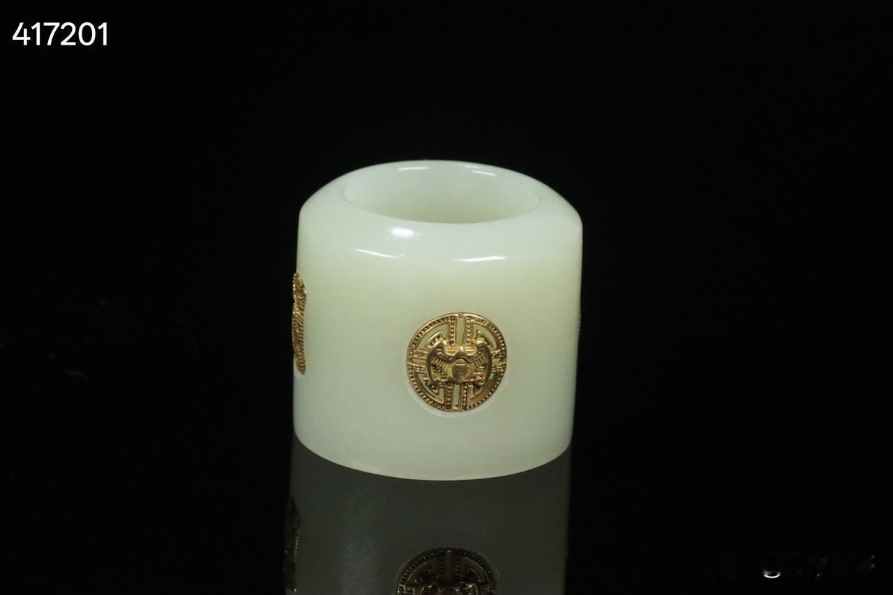 晚清 和田玉嵌银鎏金团寿纹扳指 老绣布扳指盒一套。 规格:3.15*3.78