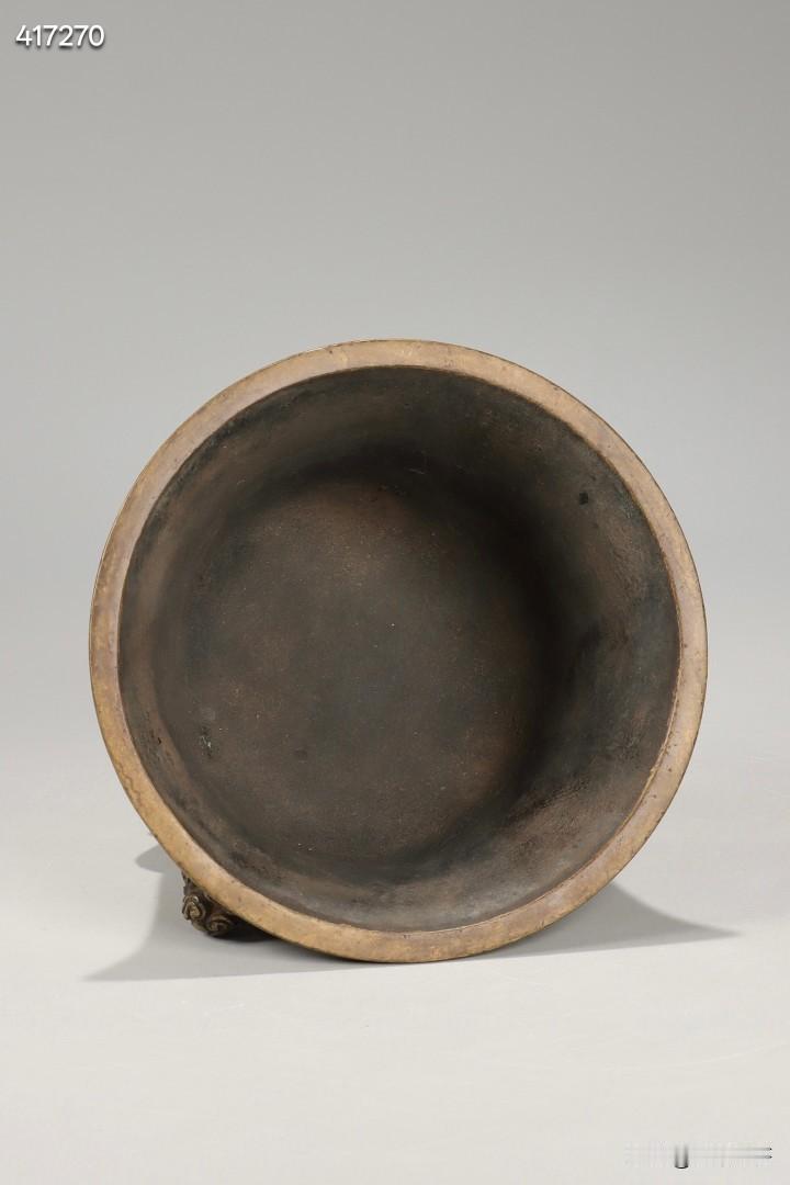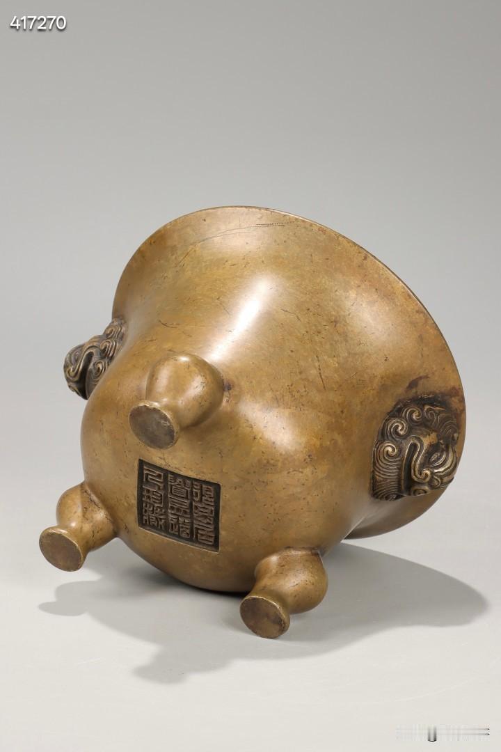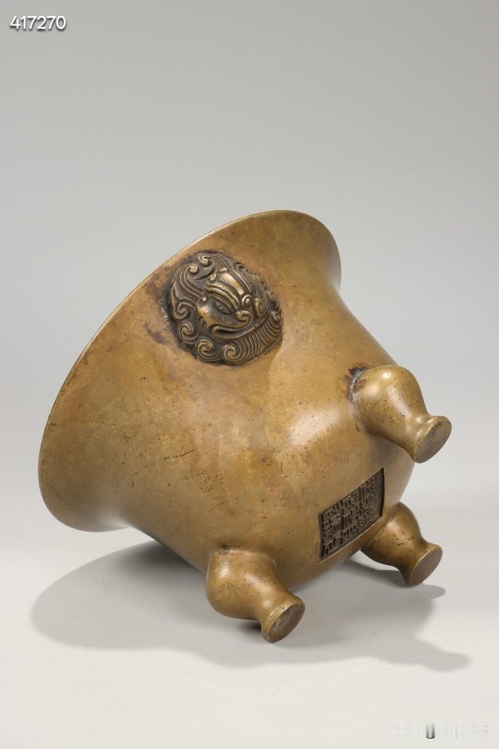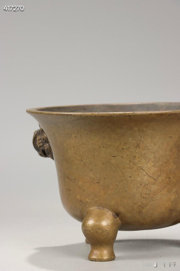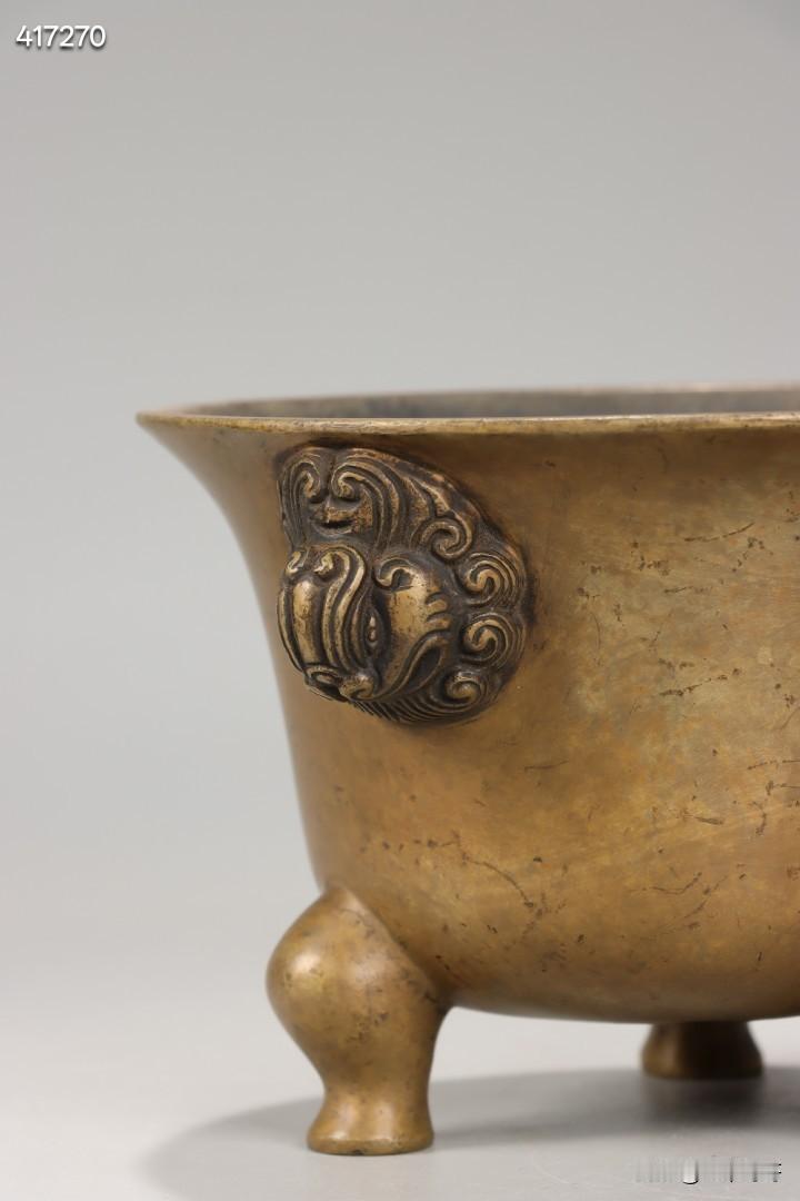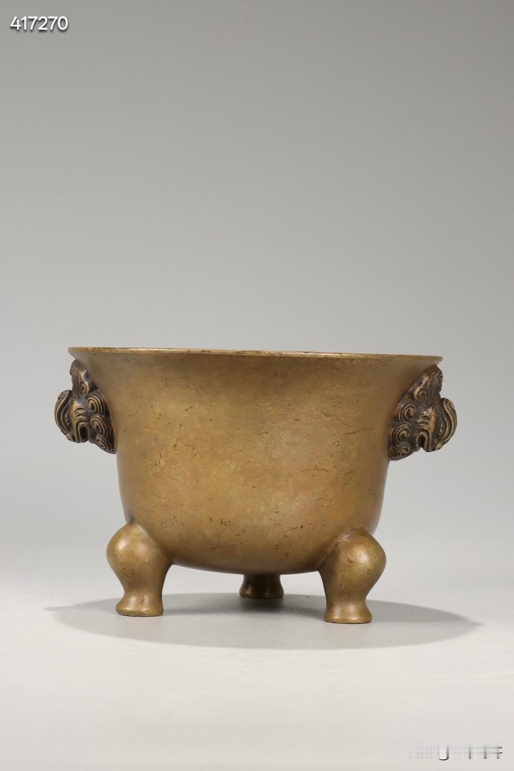 清 私家款天鸡耳三足铜炉 规格:高9.8cm,宽14cm,重1208.5g 此件清代私家款天鸡耳三足铜炉,取精铜一体铸造而成,铜质缜密坚润,包浆醇厚老道,皮壳熟旧莹润,色泽沉稳古雅,历经岁月沉淀更显温润内敛,是文房铜炉中的传世精品。
