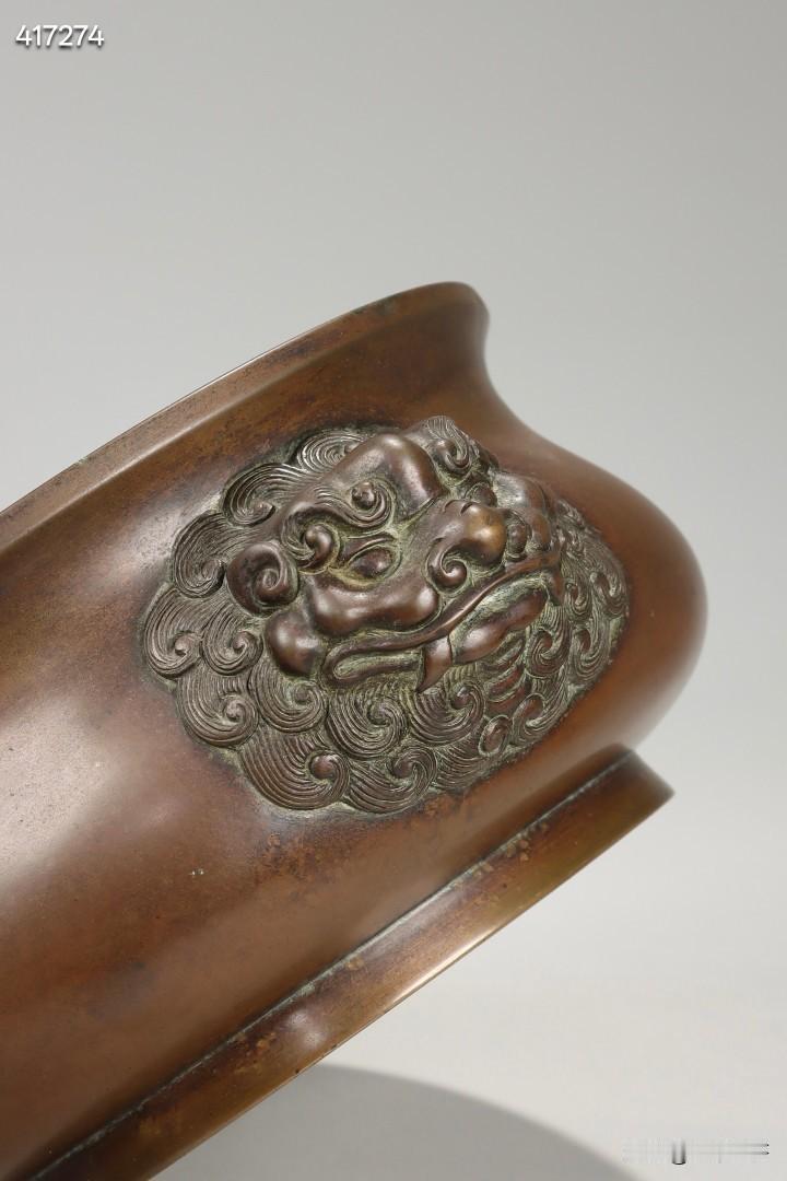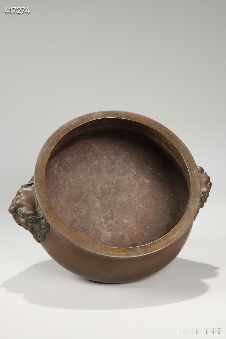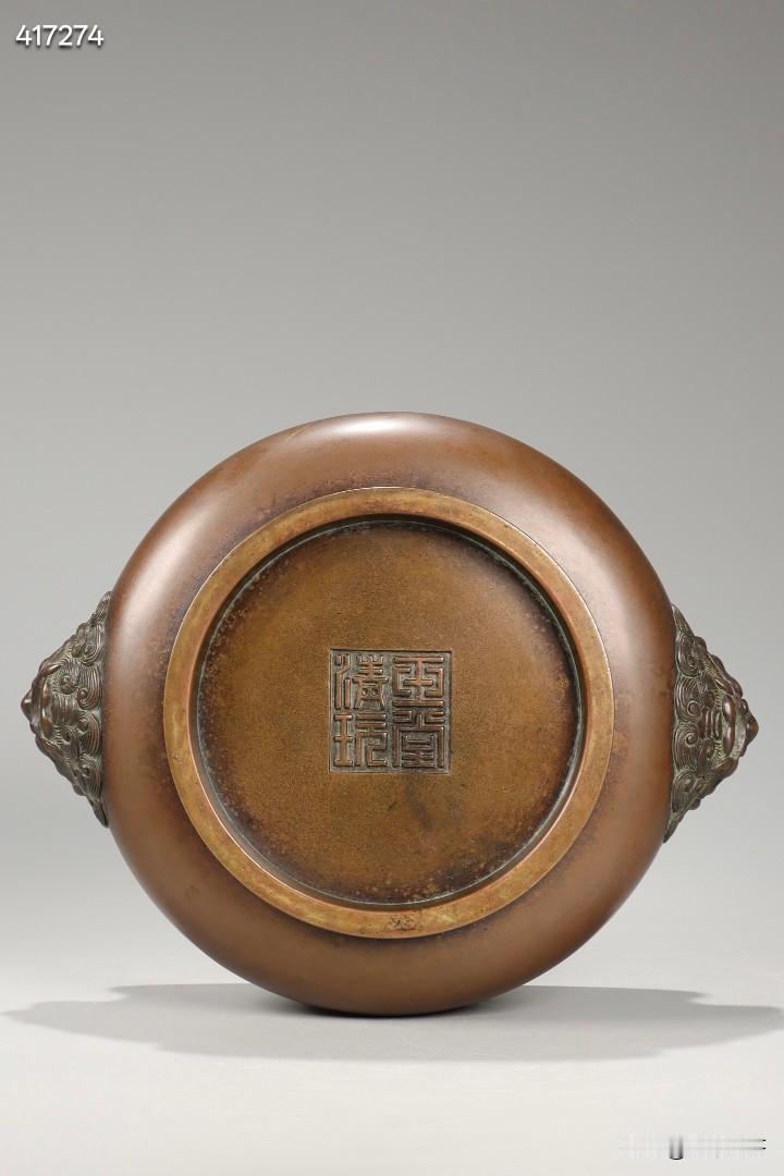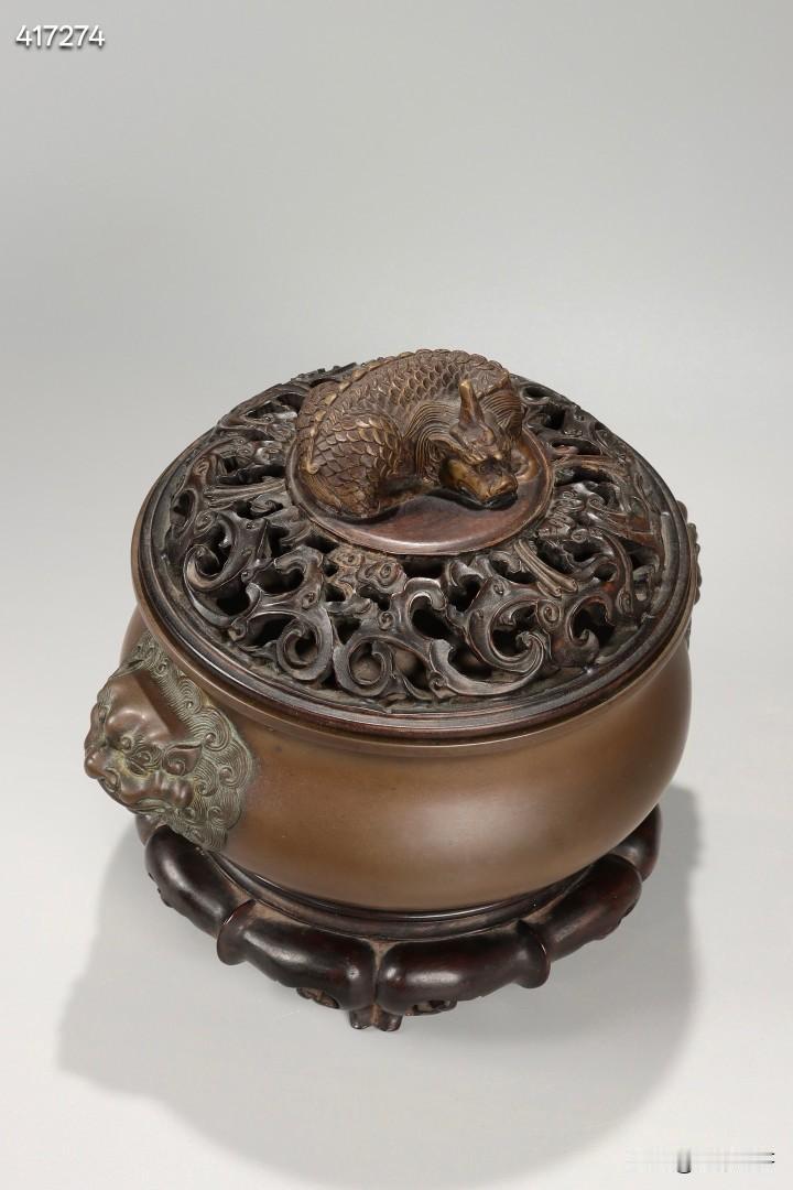 此件清代玉堂清玩款狮耳铜香炉,配原配红木盖与底座,取精炼良铜一体铸造而成,铜质缜密厚实,胎体厚重压手,包浆醇厚温润,皮壳熟旧自然,色泽古朴内敛,历经数百年岁月摩挲,更显沉稳雅致,是传世铜炉中难得的文房雅器。炉体为经典狮耳宣德炉制式,口沿平整规整,两侧置对称狮形双耳,狮耳雕刻生动,线条遒劲流畅;炉腹圆润饱满,弧度温婉大气,下承圈足,足型敦实稳健,落地沉稳有力,整体造型规整端庄,比例协调匀称,尽显清代铜炉的精湛工艺与典雅气韵。炉底落“玉堂清玩”四字款识,字体工整端庄,笔力遒劲,款识清晰规整,兼具明代堂款遗韵与清代铸炉工艺特征。