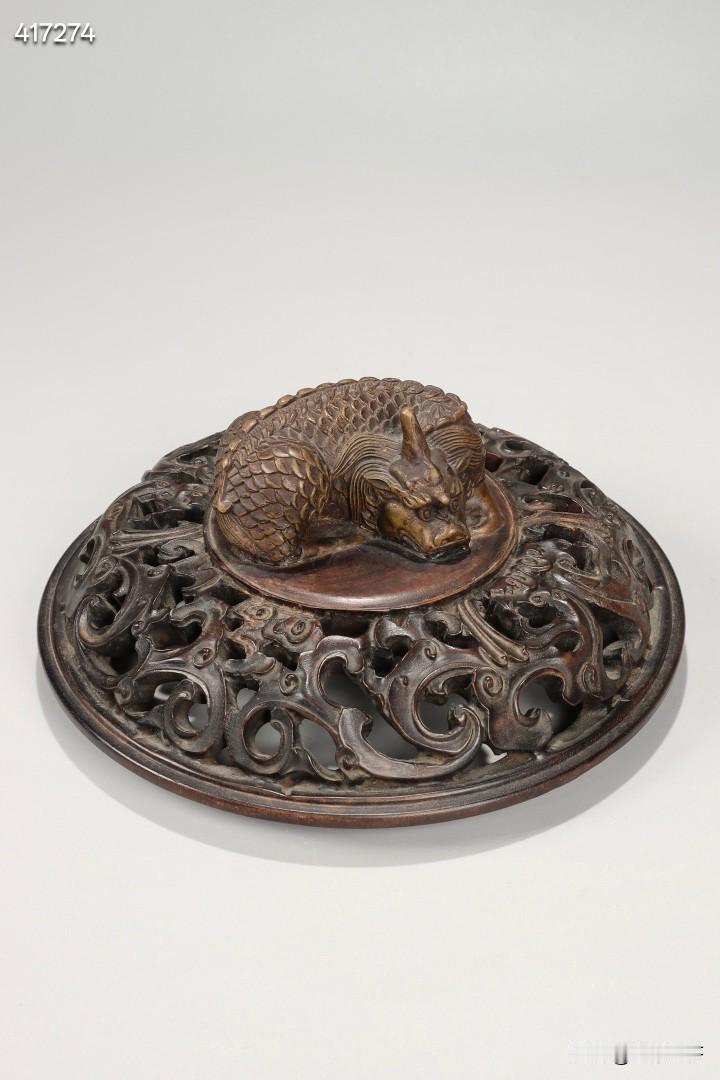 清 红木盖底玉堂清玩款狮耳炉 规格:炉高9cm,口径17.5cm,重2439.