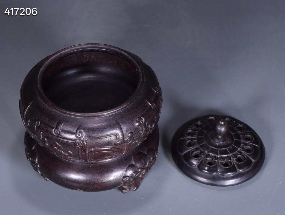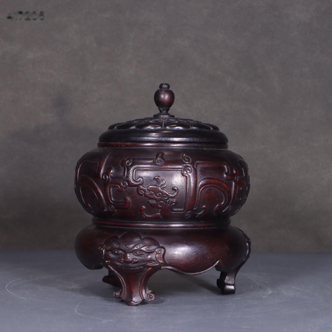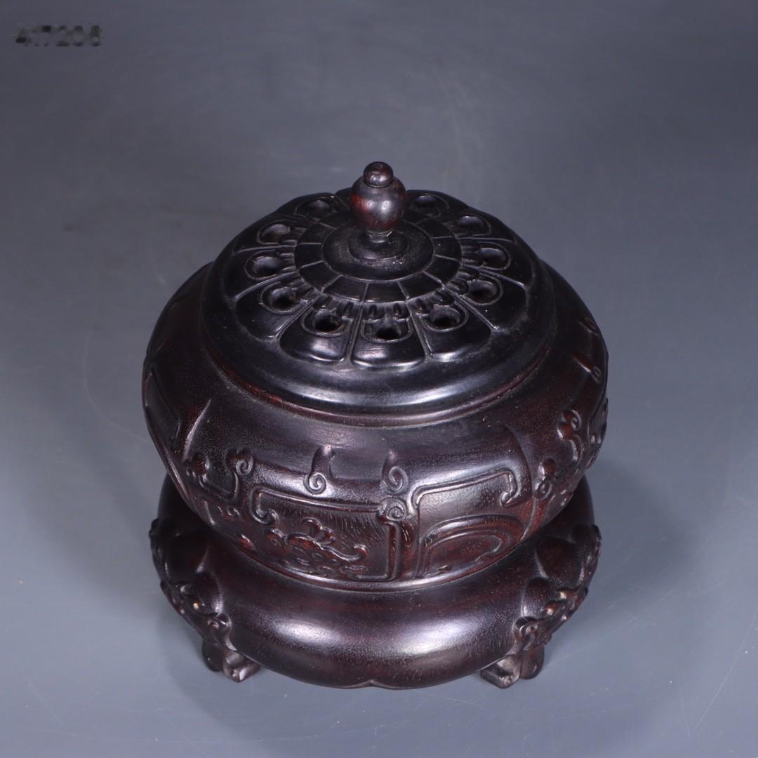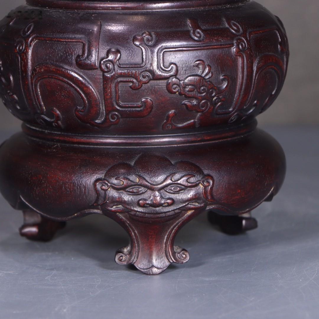 旧藏:老紫檀木雕香薰。 规格:肚径13.5厘米、高16.5厘米,重648克。 简介:此藏品取紫檀木为材,木质紧密,牛毛纹清晰,器型雅致秀气,炉身和三足一木整雕,盖钮雕葫芦,雕工精细,文房茶室点香陈设精品。品相完美。[玫瑰]