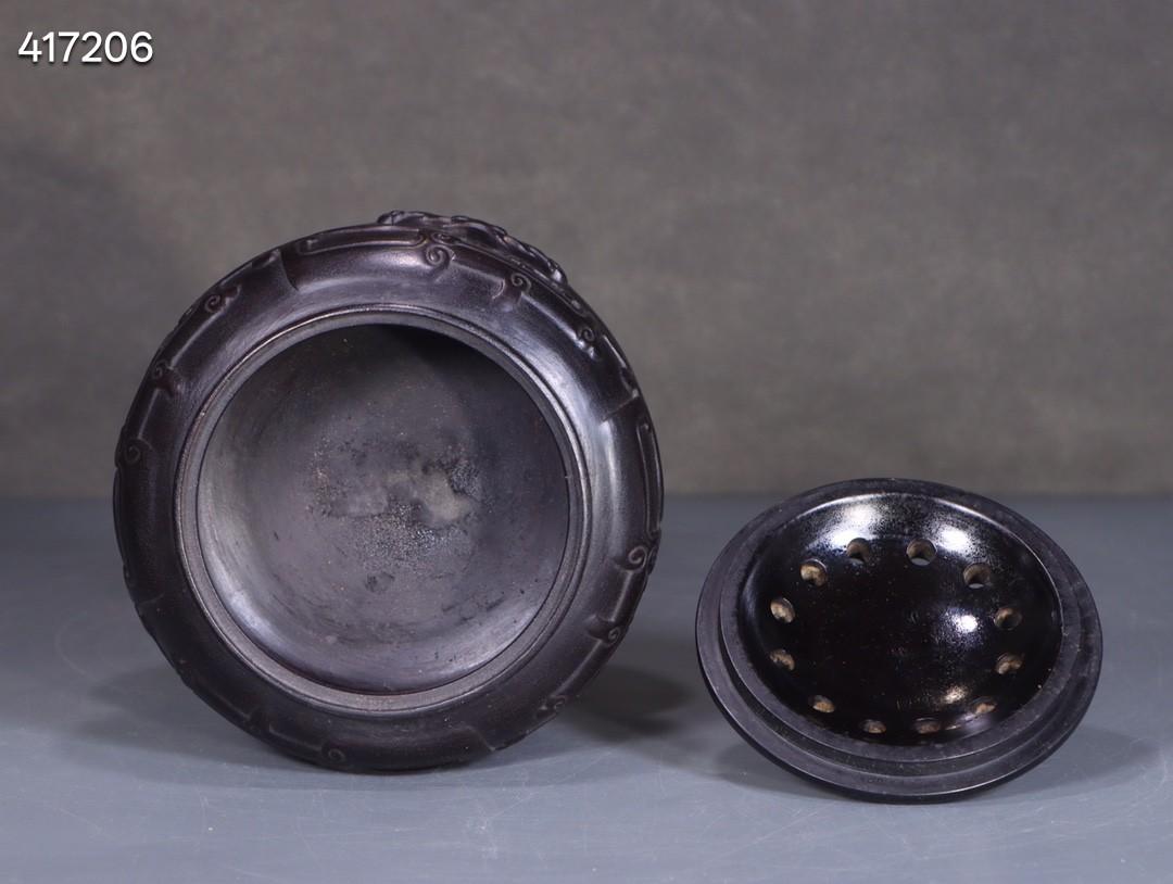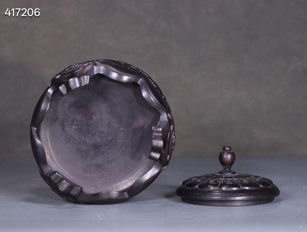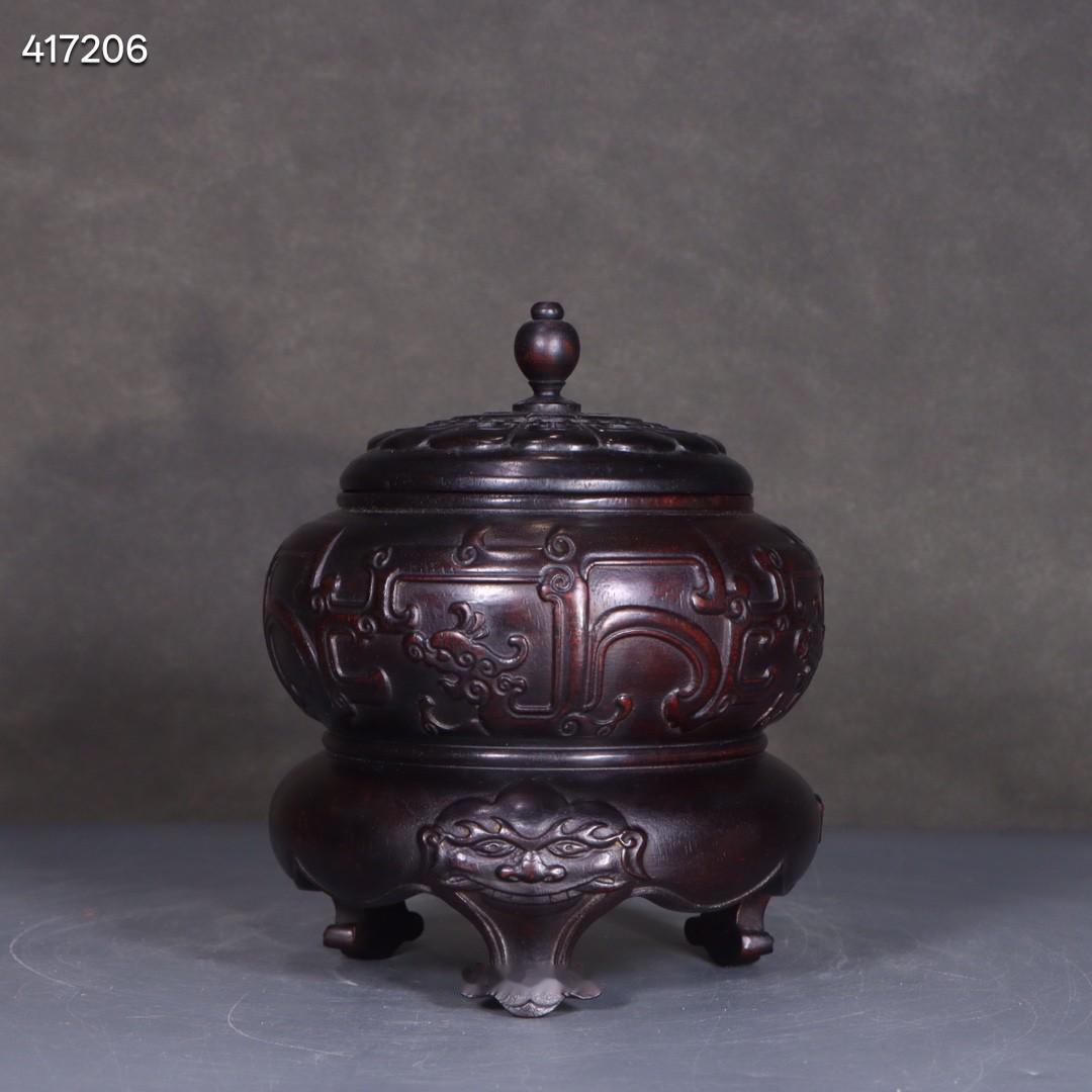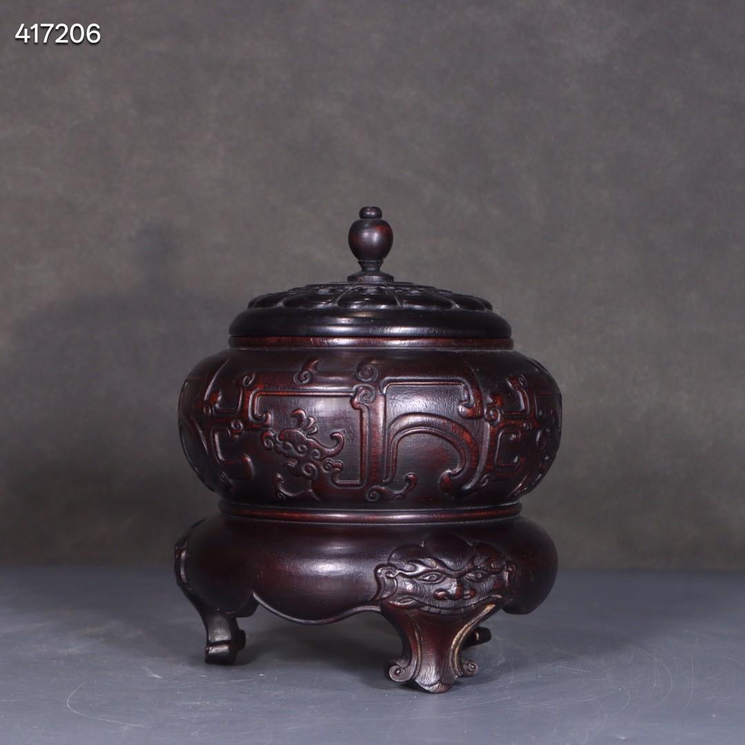 旧藏:老紫檀木雕香薰。 规格:肚径13.5厘米、高16.5厘米,重648克。 简介:此藏品取紫檀木为材,木质紧密,牛毛纹清晰,器型雅致秀气,炉身和三足一木整雕,盖钮雕葫芦,雕工精细,文房茶室点香陈设精品。品相完美。[玫瑰]