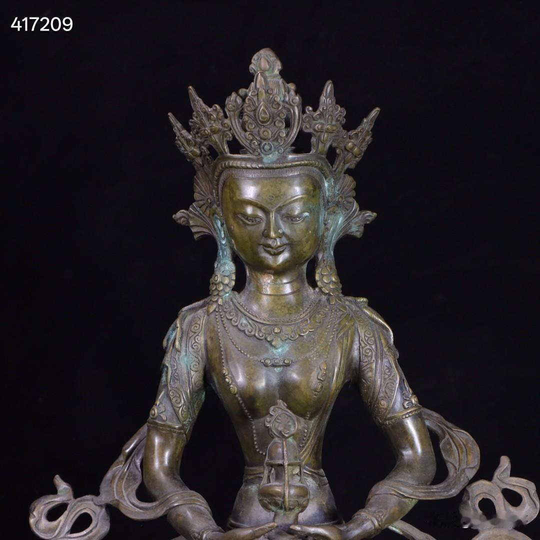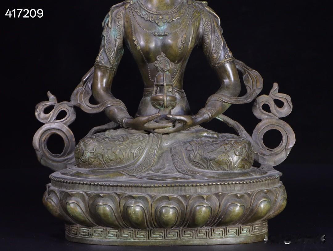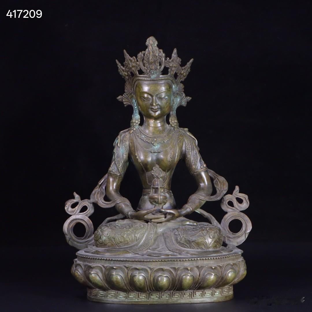清:铜长寿佛摆件。 规格:高38厘米、宽27.8厘米、厚18.2厘米,重4008克。 简介:此藏品铜胎,佛像开脸端庄,衣饰飘逸,錾刻精细,整器精美,线条清晰优雅,原封底,裹浆醇厚,通体古栗,收藏佳品。[玫瑰]
