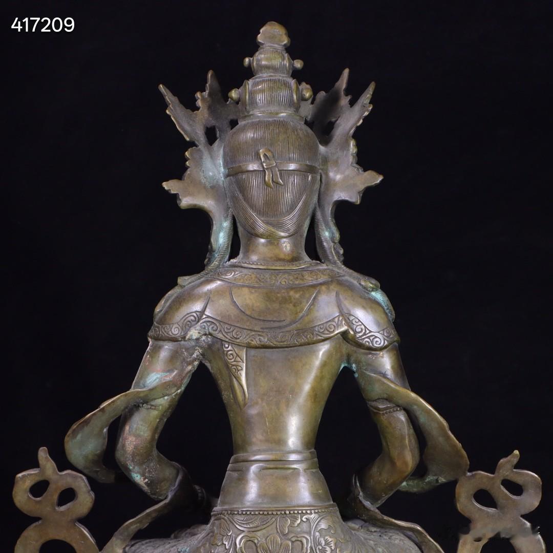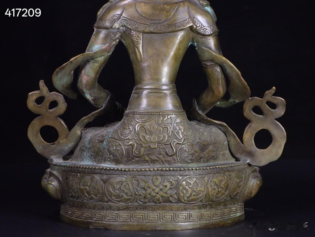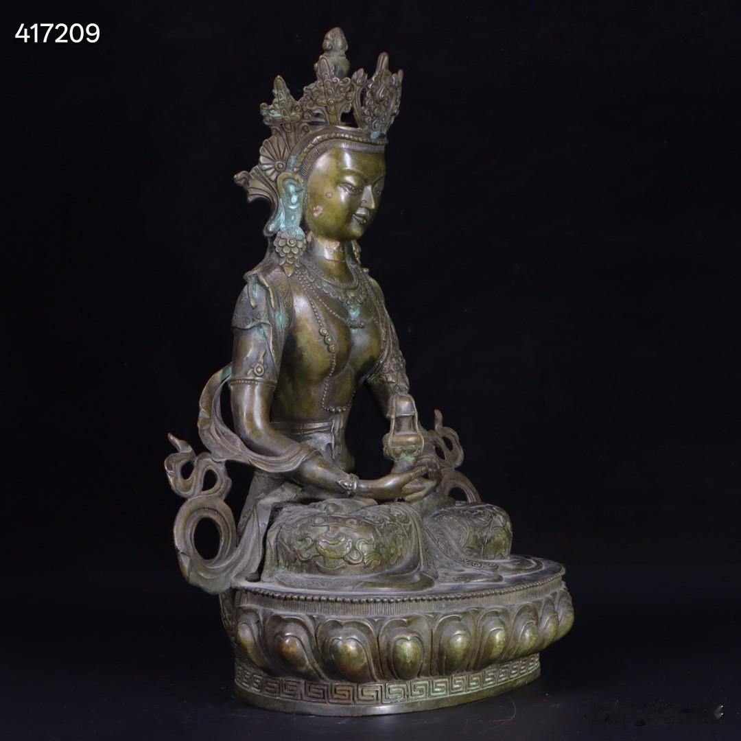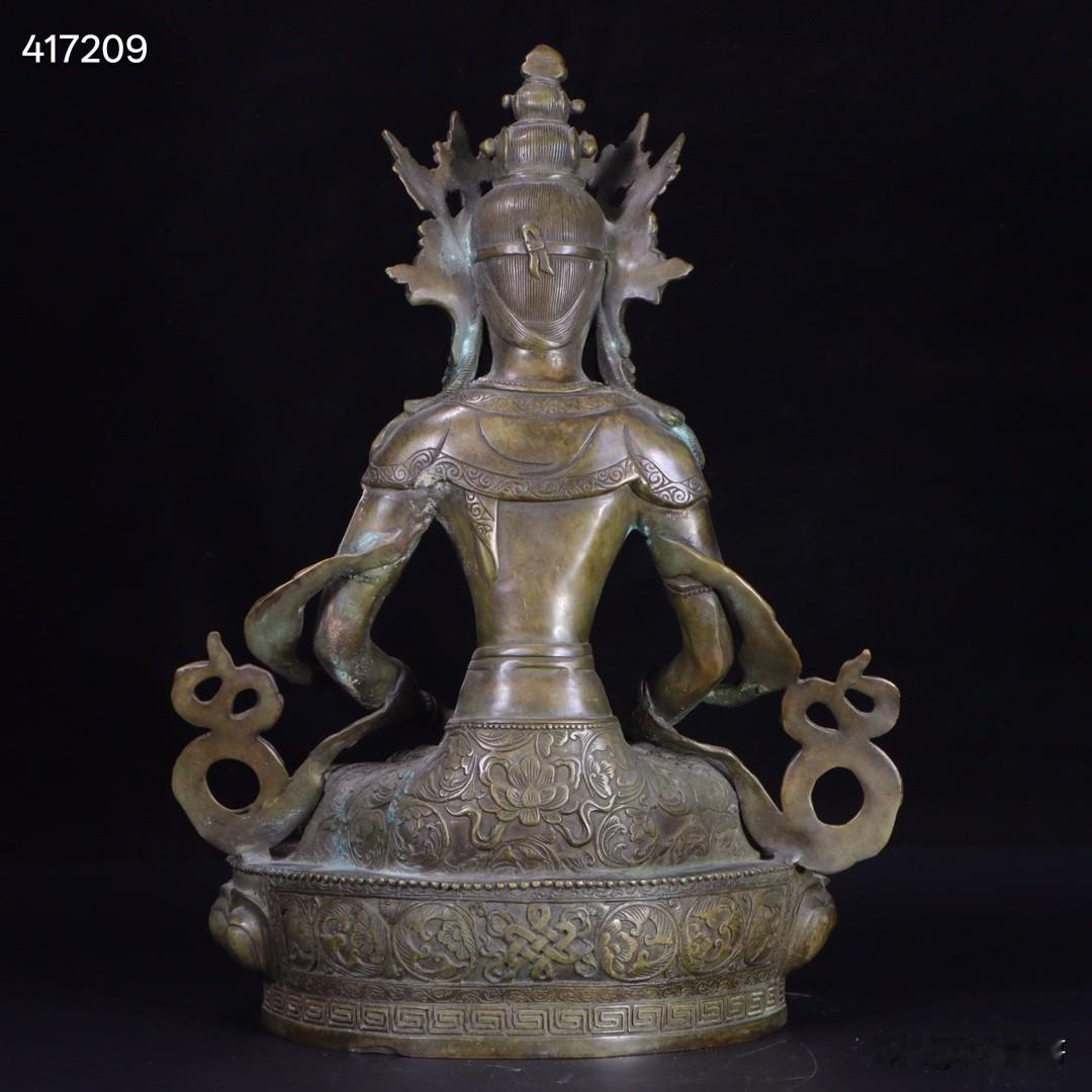 清:铜长寿佛摆件。 规格:高38厘米、宽27.8厘米、厚18.2厘米,重4008克。 简介:此藏品铜胎,佛像开脸端庄,衣饰飘逸,錾刻精细,整器精美,线条清晰优雅,原封底,裹浆醇厚,通体古栗,收藏佳品。[玫瑰]