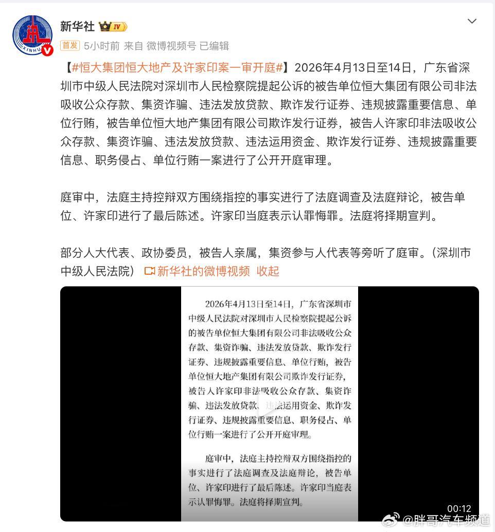 恒驰汽车一车未发市值高达7500亿港元恒大集团恒大地产及许家印案一审开庭 曾经的地产帝国... 许家印一审当庭认罪悔罪