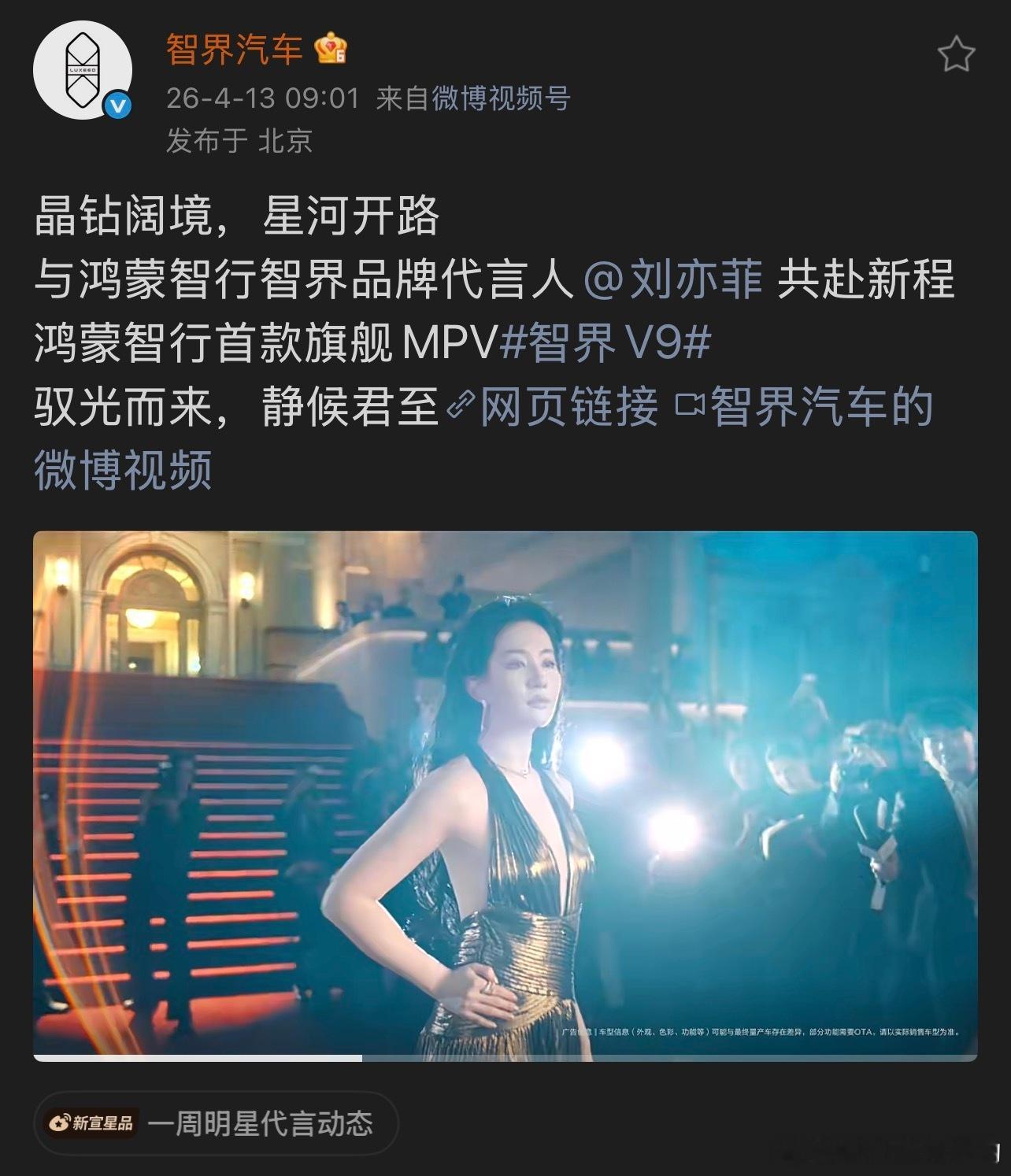 刚看到刘亦菲代言智界v9 了不冲别的,就冲她,智界V9真的有品位
