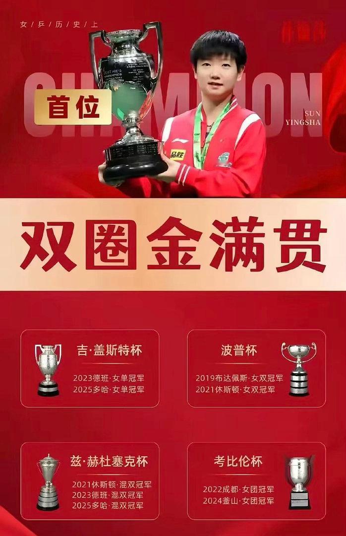 乒乓球 乒乓球领域:孙颖莎获官方最高认证2026年4月13日,国际乒联官网发布文章,介绍 2026伦敦世界乒乓球团体锦标赛中国队阵容。原文:"Defending the Women's Team crown, China puts its faith in megastar Sun Yingsha."(为卫冕女团冠军,中国队将重任交托给超级巨星孙颖莎)这是国际乒联/WTT体系内,首次在官方正式文稿中公开使用 "megastar" 定义孙颖莎,也是本次世乒赛所有选手中唯一获此称号的运动员。国际乒联官网也曾直接冠以该称号,评价她"拥有乒坛无人能及的心态和实力"。这是体育组织授予现役运动员的顶级荣誉。高于superstar,是现役运动员最高官方认证。核心成就:她是女乒历史首位世锦赛双圈金满贯得主,世界杯三连冠达成者,累计19个世界冠军,长期稳居女单世界第一,外战保持全胜。