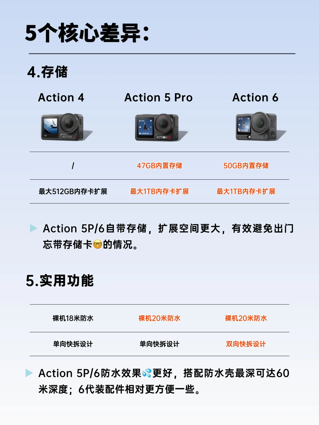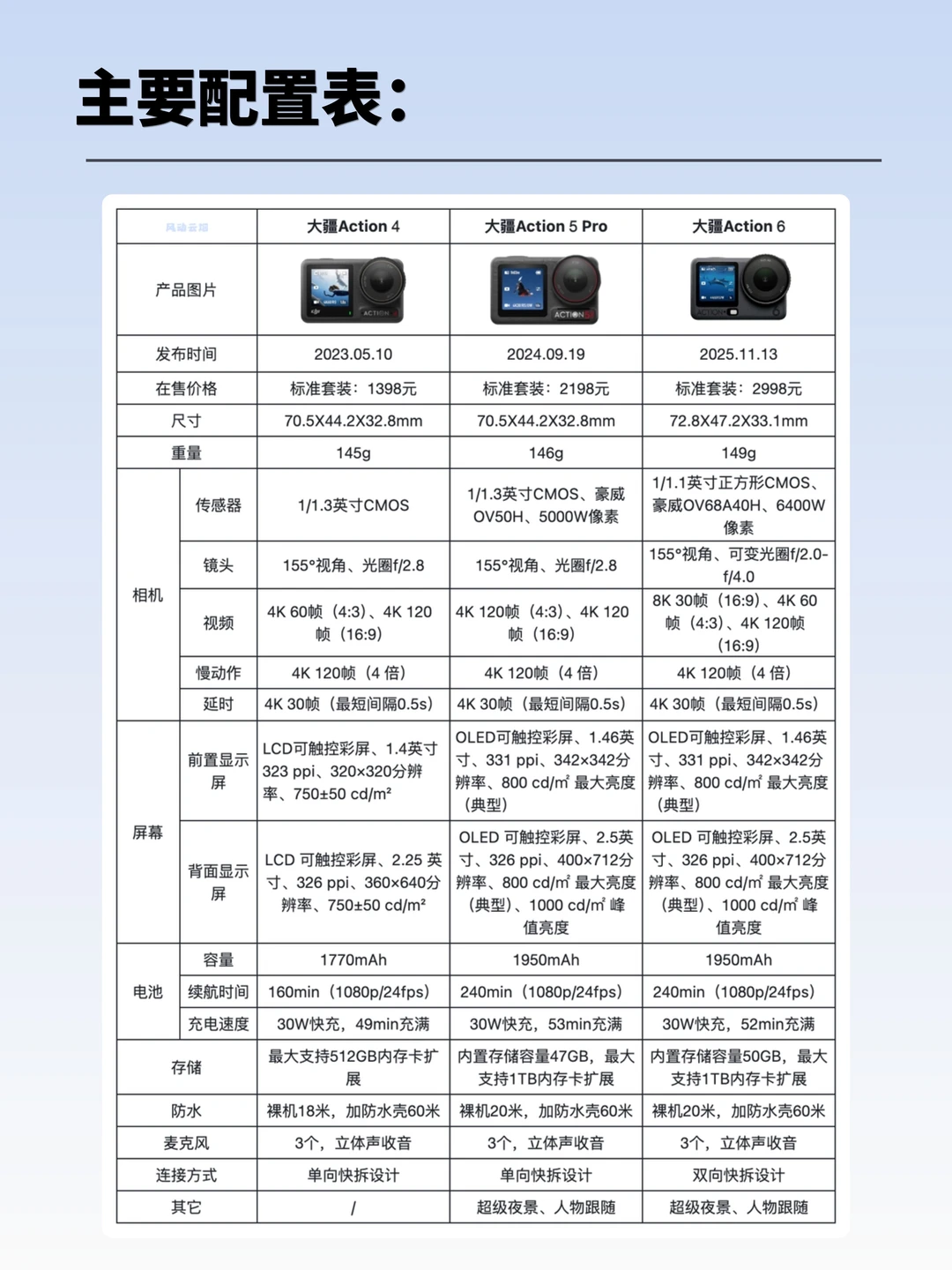Action 4、Action 5 Pro、Action 6,3️⃣台机器三个档位,起步价从💰1398到💰2998,足足[扶墙R]差了1600块。