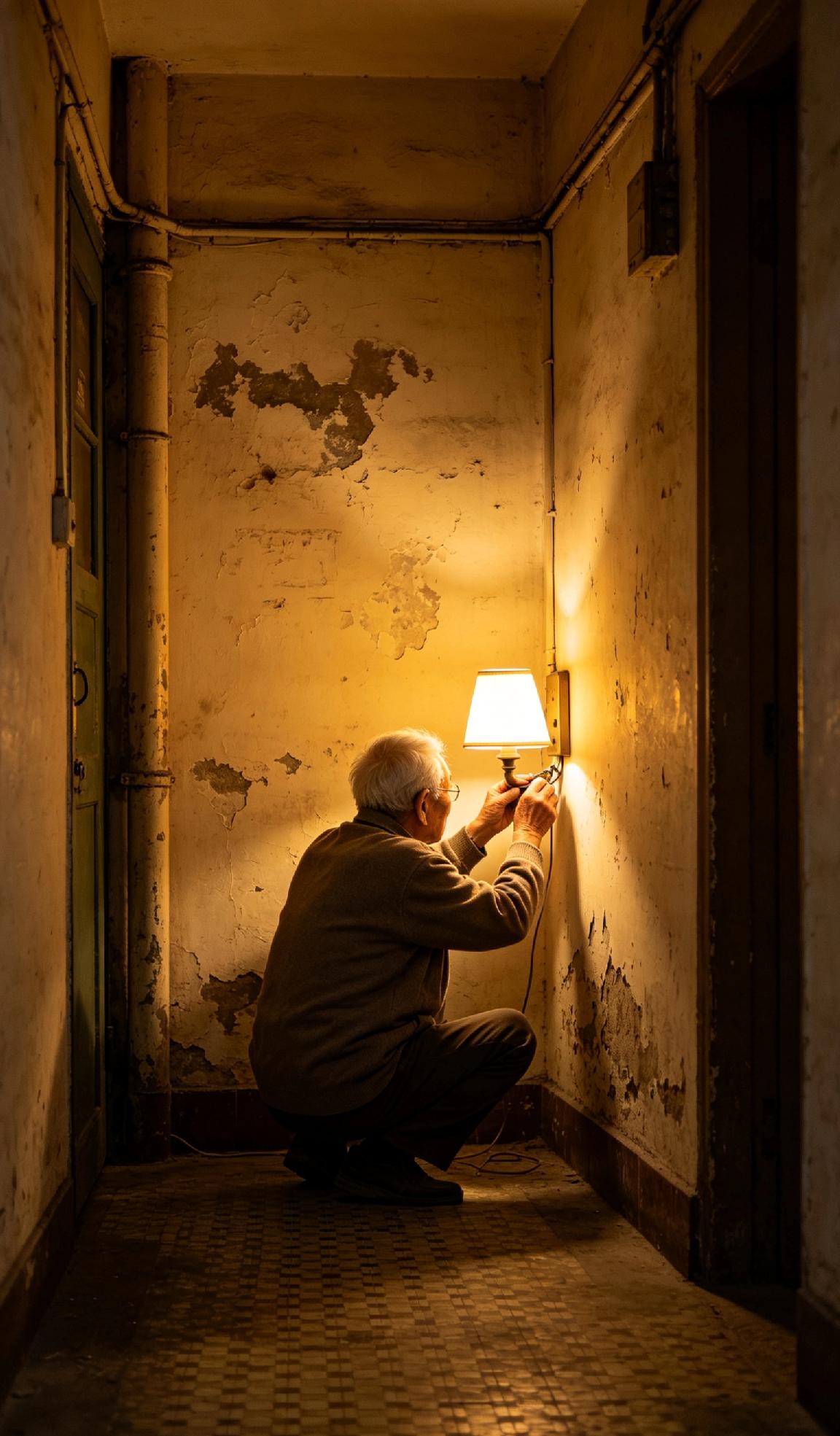 直到周末午后,我刚开门,就撞见对门的张大爷,搬着个破旧的小凳子,蹲在转角处,正用抹布仔细擦着壁灯上的灰尘。他头发全白了,背驼得厉害,手上布满老茧,动作慢悠悠的,却格外认真。