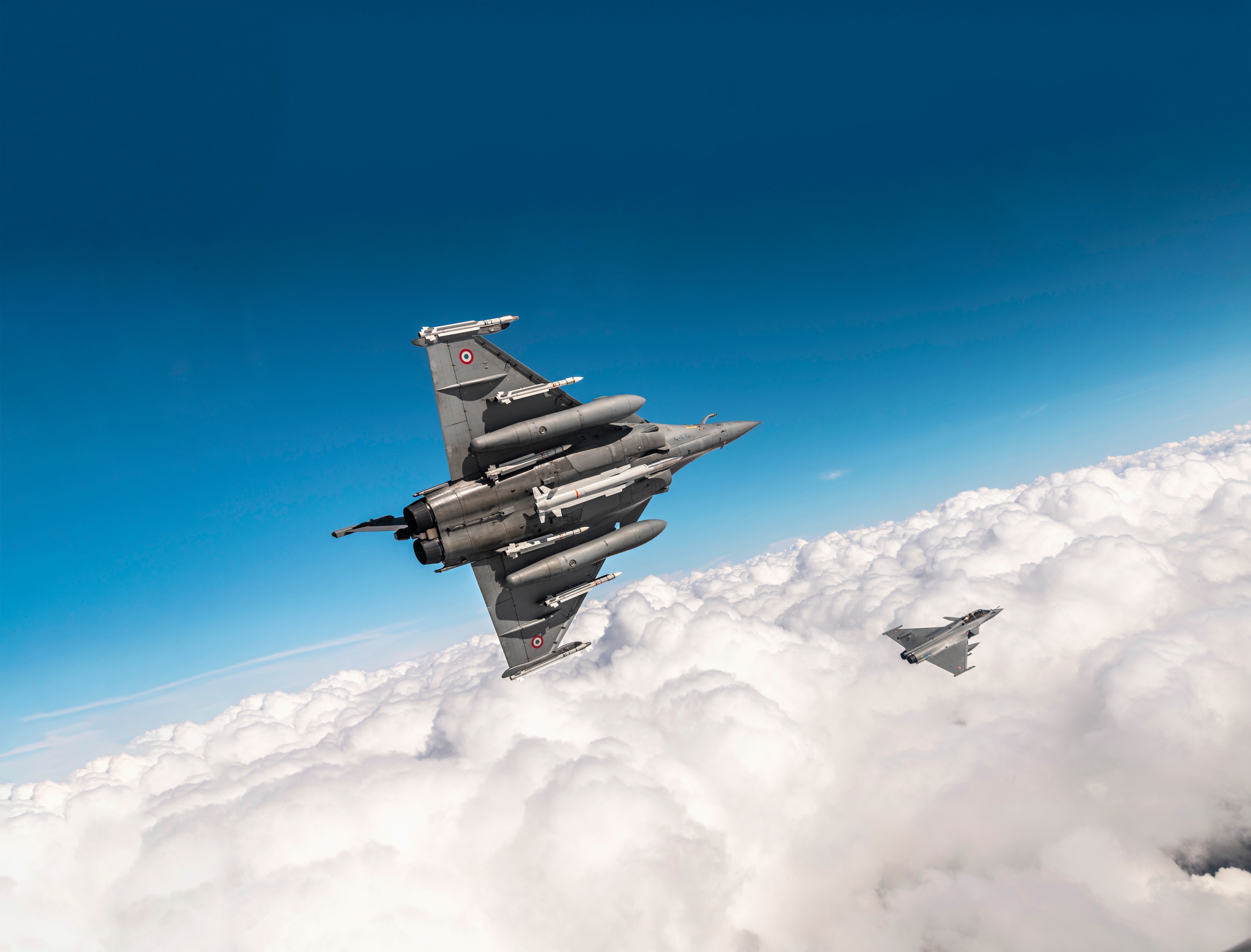来自1/4 Gascogne中队的法国战略空军(FAS)阵风B携带ASMPA-R核超音速巡航导弹模型,飞越法国西海岸。
