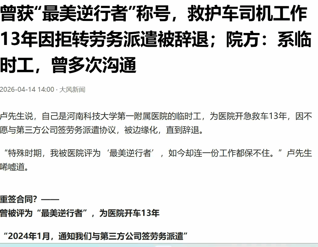 院前急救驾驶属于医疗配套的核心岗位,与患者的生命安全紧密相关,并非临时性辅助岗位。这名驾驶员用十三年青春守护急救生命线,曾因奉献获得荣誉,却因拒绝转签劳务派遣合同被辞退,一段长期稳定的职业生涯,以这样的方式仓促画上句号。