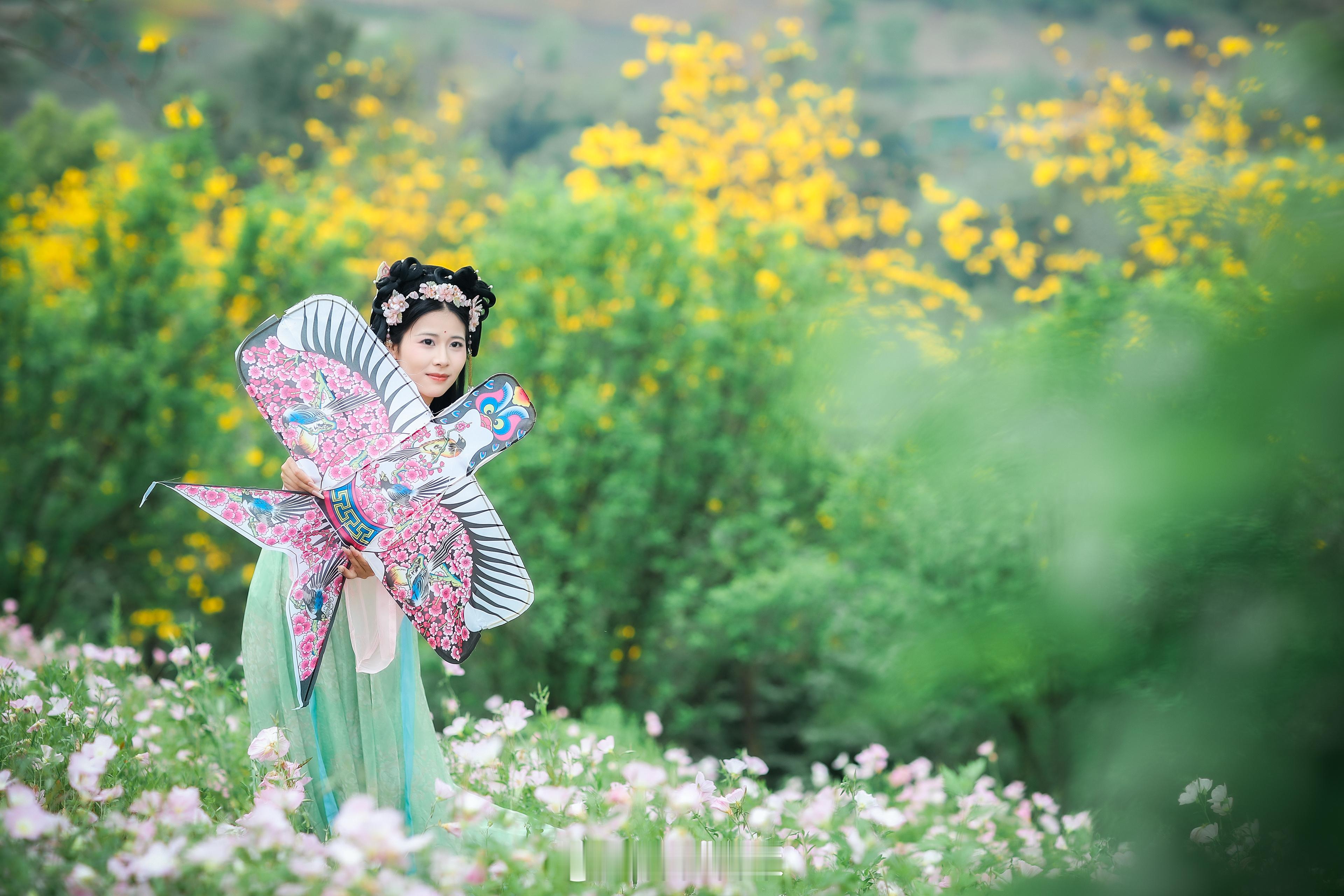 在古色古香的背景下,一袭华美汉服与淡雅花枝相映成趣,仿佛穿越千年时光。衣袂飘飘间