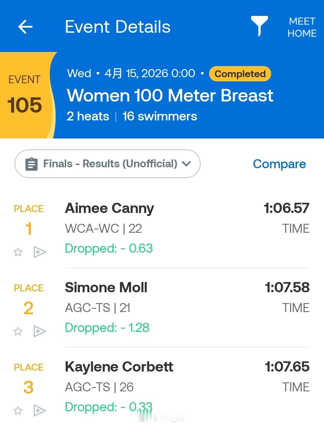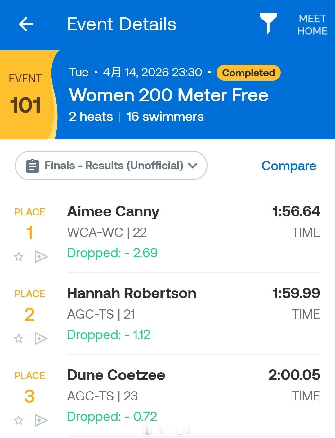 南非游泳锦标赛 第一天决赛男100仰:Pieter Coetze 52.40女200自:Aimee Canny 1:56.64女100蛙:Aimee Canny 1:06.57